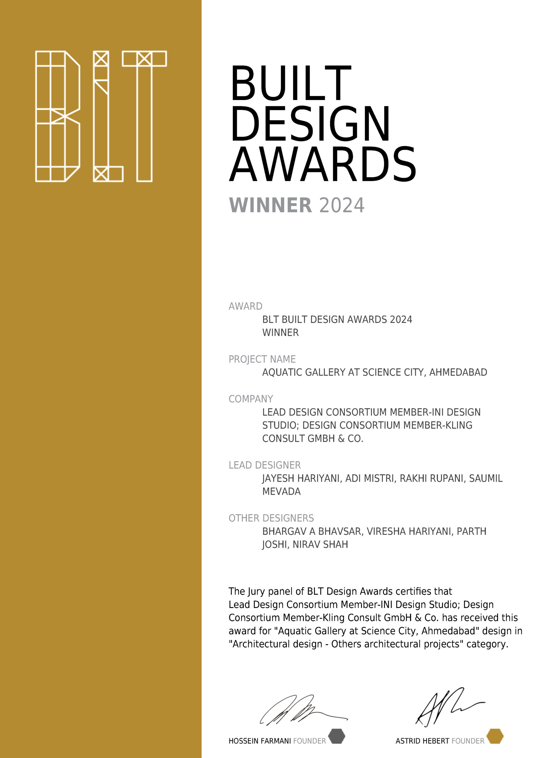 Aquatic Gallery at Science City, Ahmedabad has received the BLT Built Design Awards 2024 in Architectural design - Others architectural projects category.