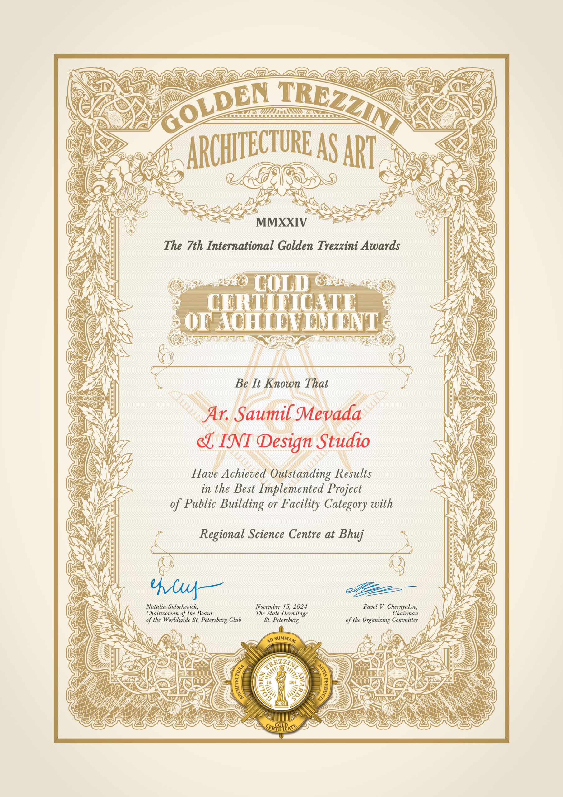 Regional Science Centre at Bhuj has been won Gold Certificate for Golden Trezzini Awards 2024 in the Best Implemented Project of Public Building or Facility category.