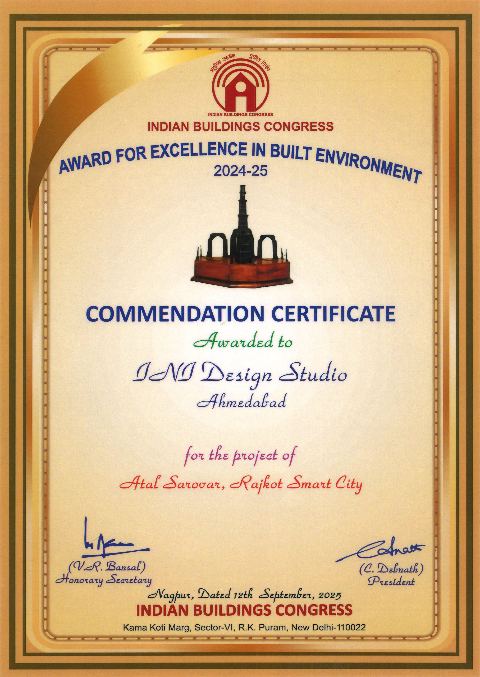 Indian Building Congress (IBC) Award for Excellence in built environment 2024-25 Commendation Certificate awarded to INI Design Studio for the project of Atal Sarovar, Rajkot Smart City.
