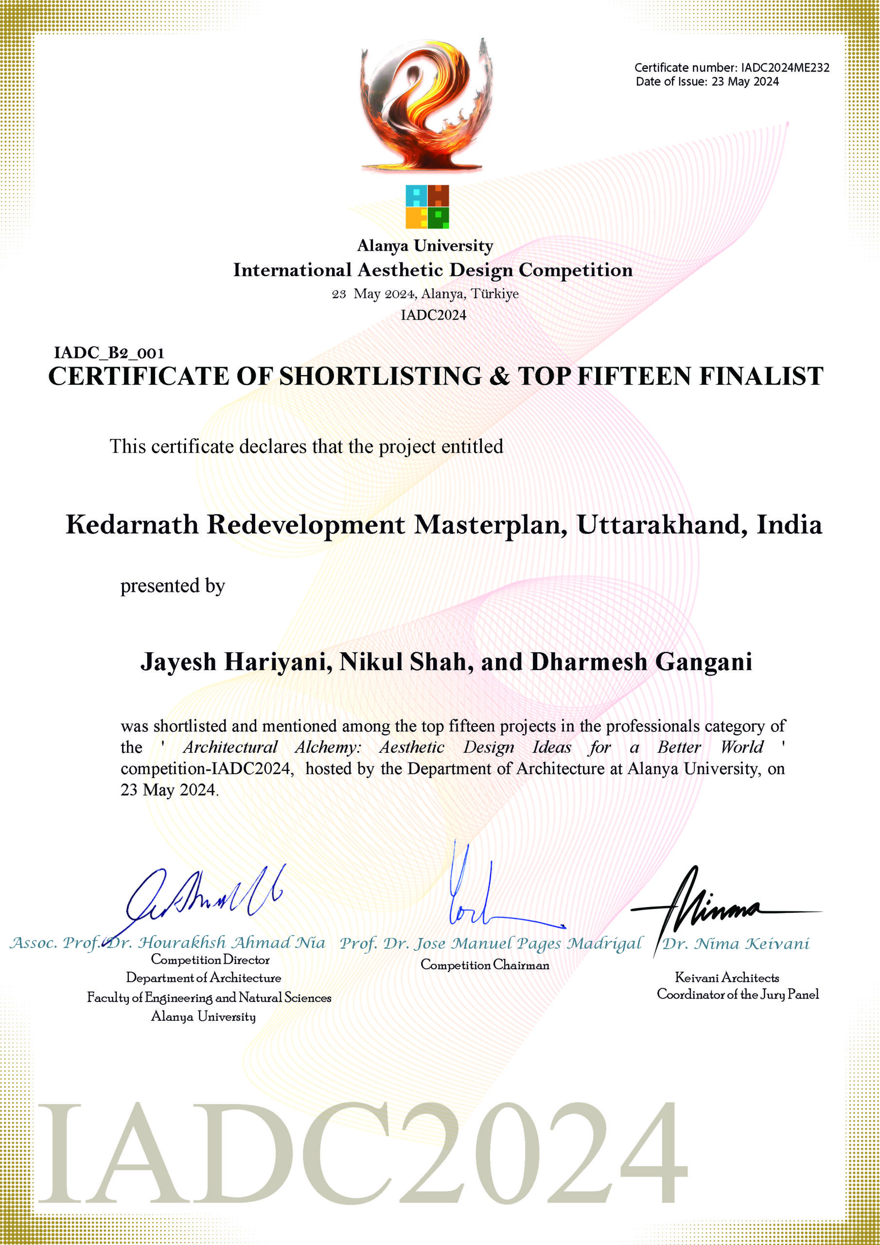 INI Design Studio honored to receive awards for Kedarnath Redevelopment Masterplan (Top Fifteen Finalist) in recognition of innovative design contribution to the "Architectural Alchemy: Aesthetic Design Ideas for a Better World" Competition (IADC 2024), hosted by the Department of Architecture at Alanya University, Türkiye.