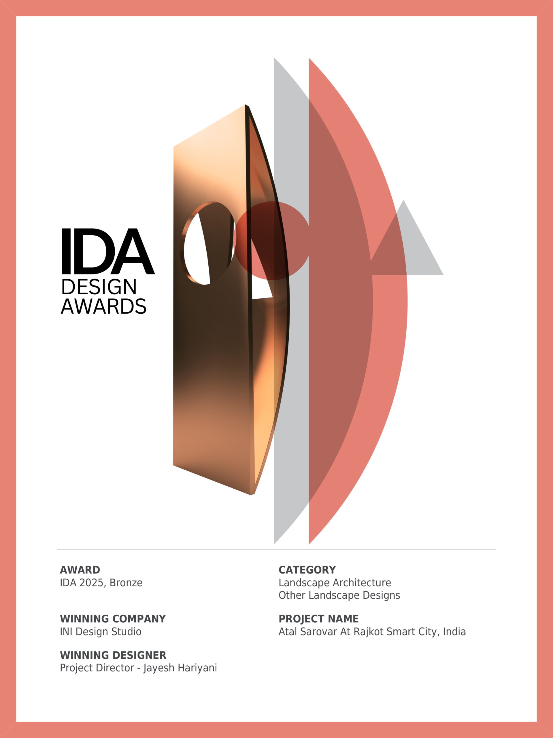 Atal Sarovar at Rajkot Smart City won Bronze Award in the Landscape Architecture - Other Landscape Designs category at the International Design Awards (IDA) 2025.