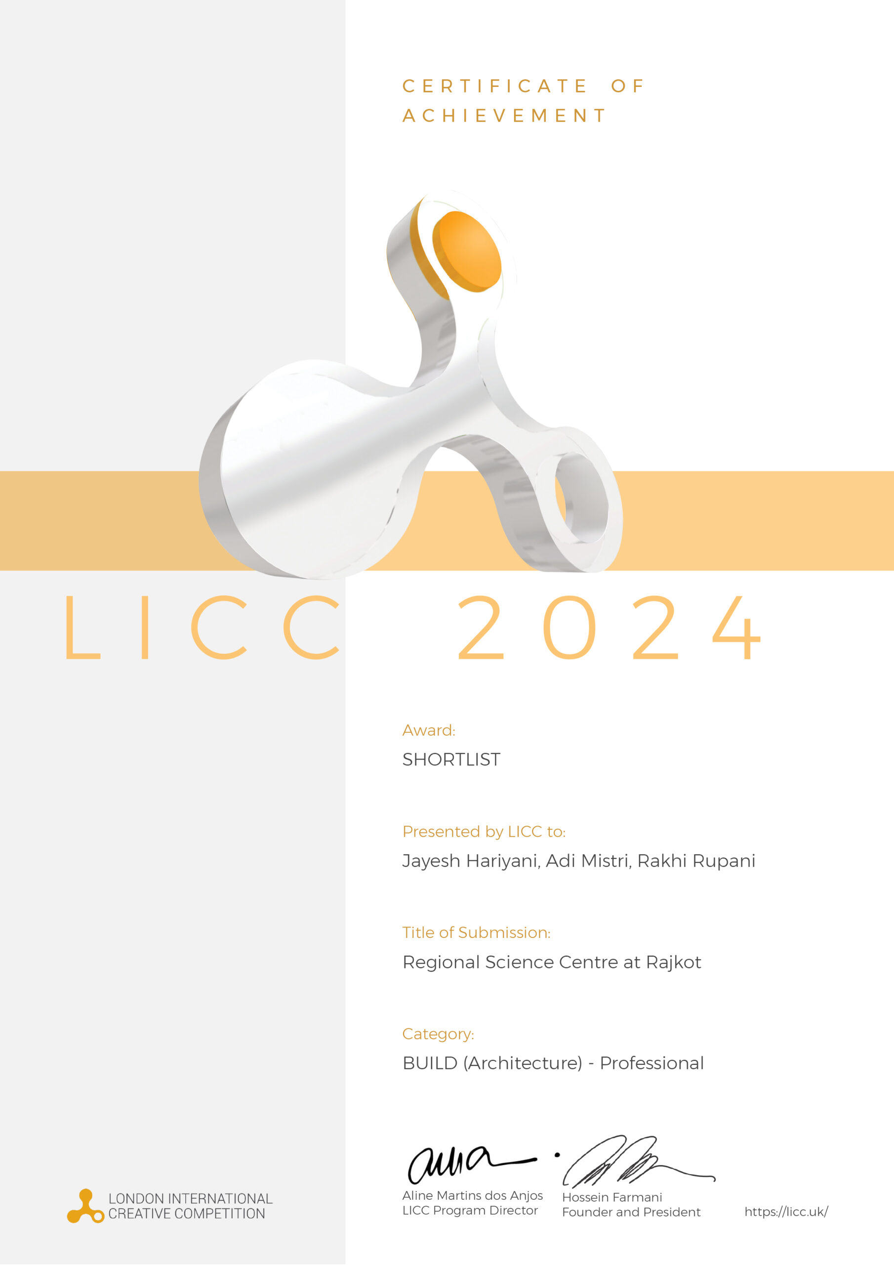 Regional Science Centre at Rajkot has been Shortlist in BUILD (Architecture) - Professional category at London International Creative Competition 2024.