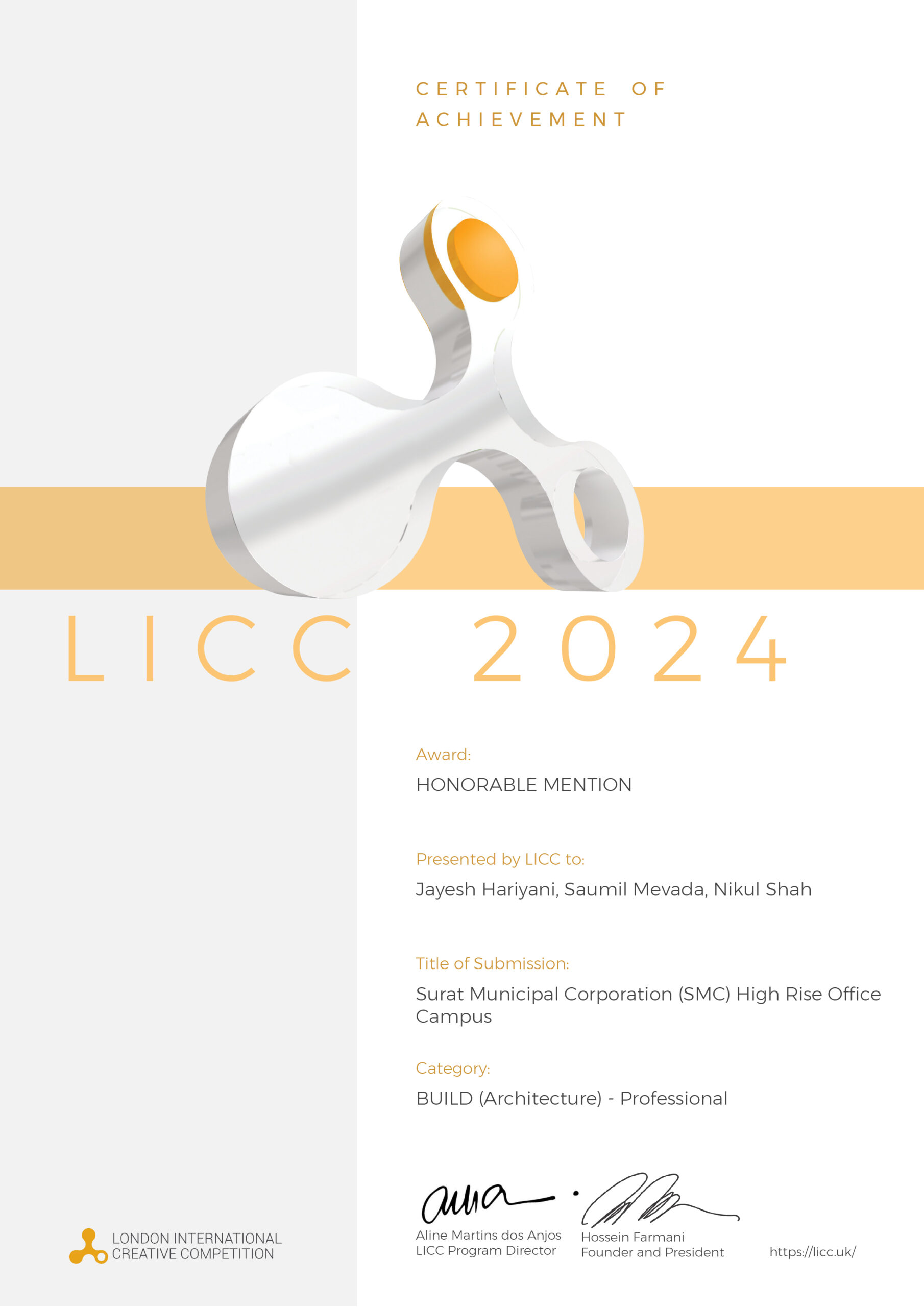 Surat Municipal Corporation (SMC) High Rise Office Campus has received Honorable Mention in BUILD (Architecture) - Professional category at London International Creative Competition 2024.
