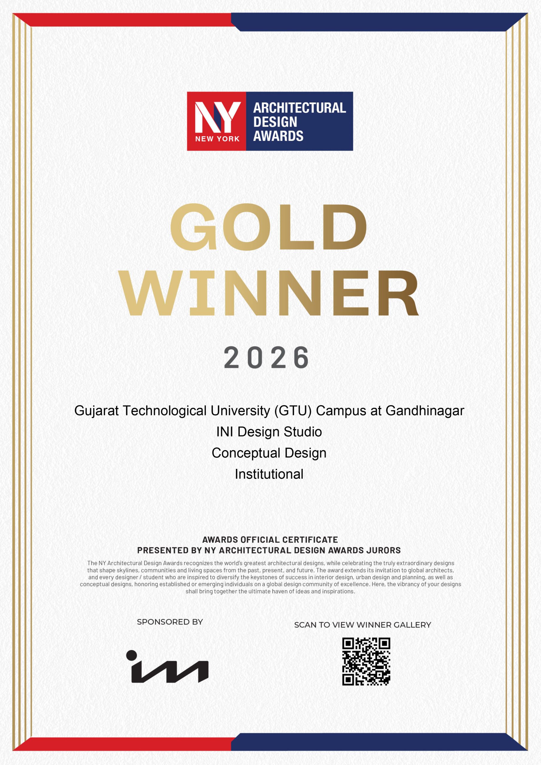 Gujarat Technological University (GTU) Campus at Gandhinagar won Gold Award in Conceptual Design - Institutional category at New York (NY) Architectural Design Awards 2026.