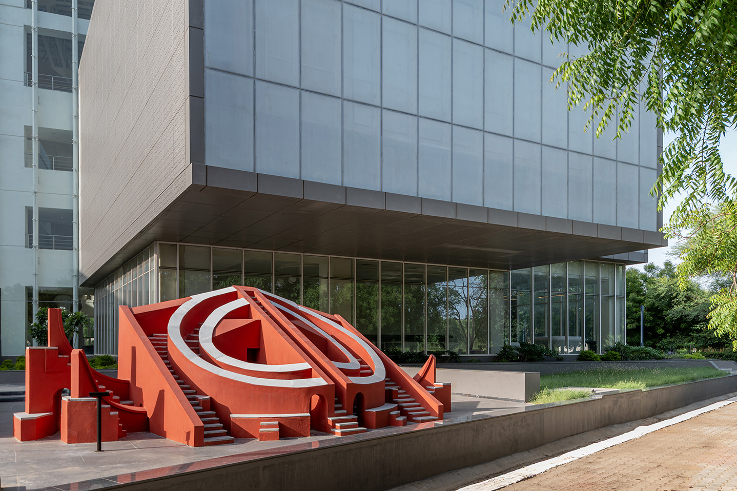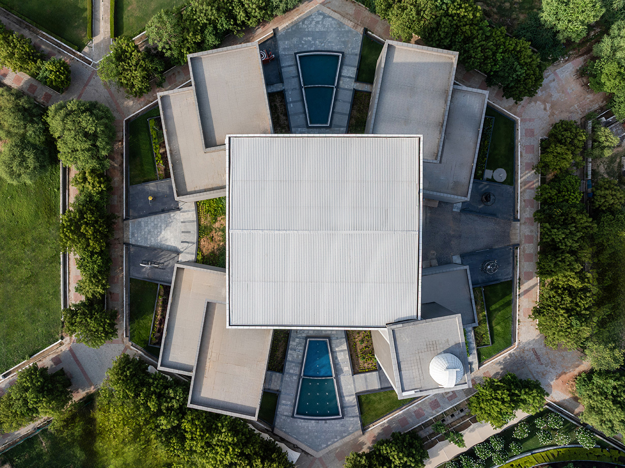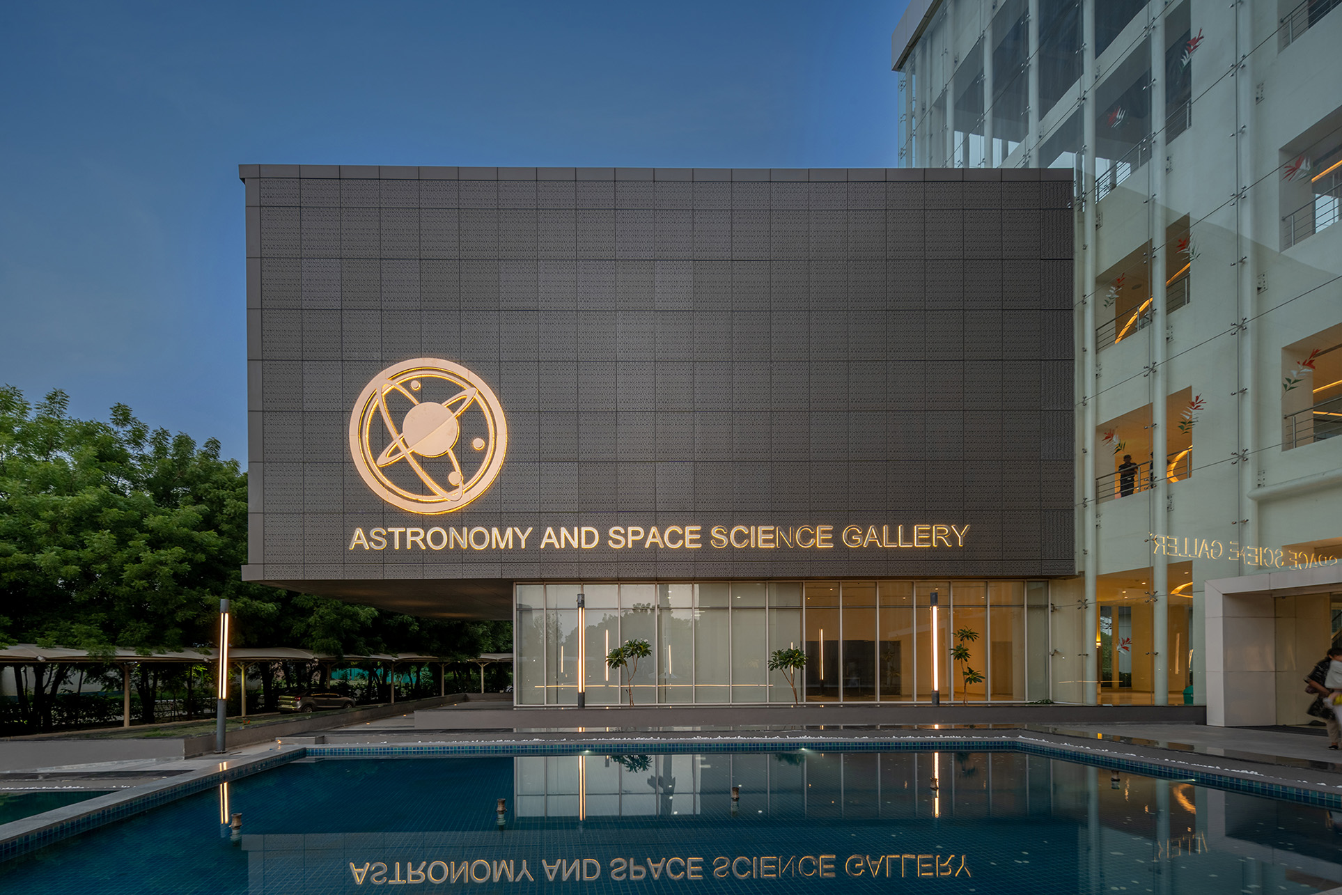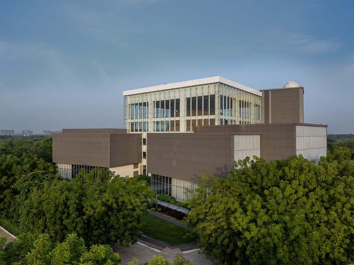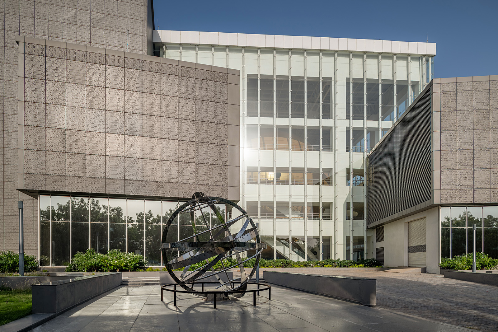 The design dispenses the gallery in 5 blocks, 4 of them surrounding the central three floors high atrium block enveloped in transparent glazing system inside which a massive brass-plated globe representing the sun is housed, visible from the surrounding landscaped exteriors. A combination of soft and hardscapes and water features that surround the structure is intermittently adorned with large interactive outdoor exhibits like a tellurian, a moon-buggy racer and miniature Jantar Mantar to create an irresistibly inviting venue for visitors.