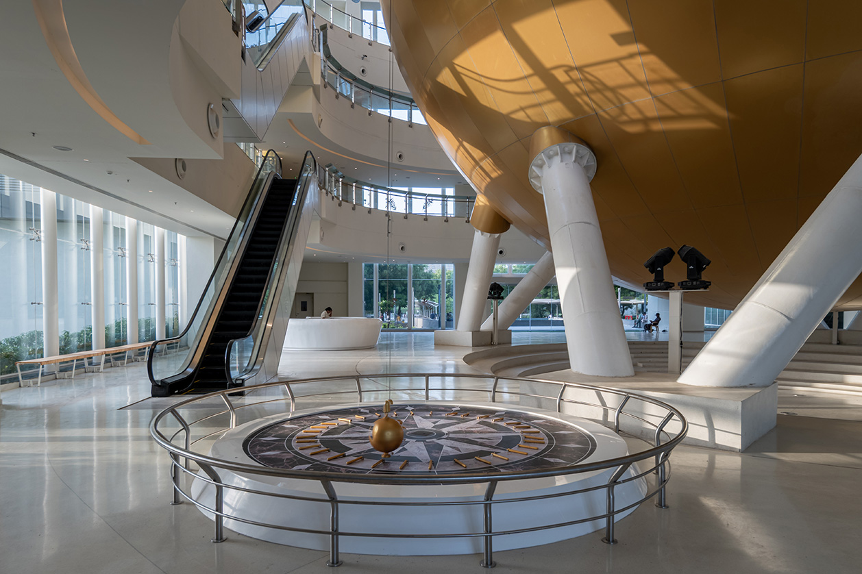 complete the solar system model. Infographics about each planet adorn the top counter of parapet wall of these circulatory passages encircling the atrium’s centre, which also has a Foucault’s Pendulum and an Orrery.