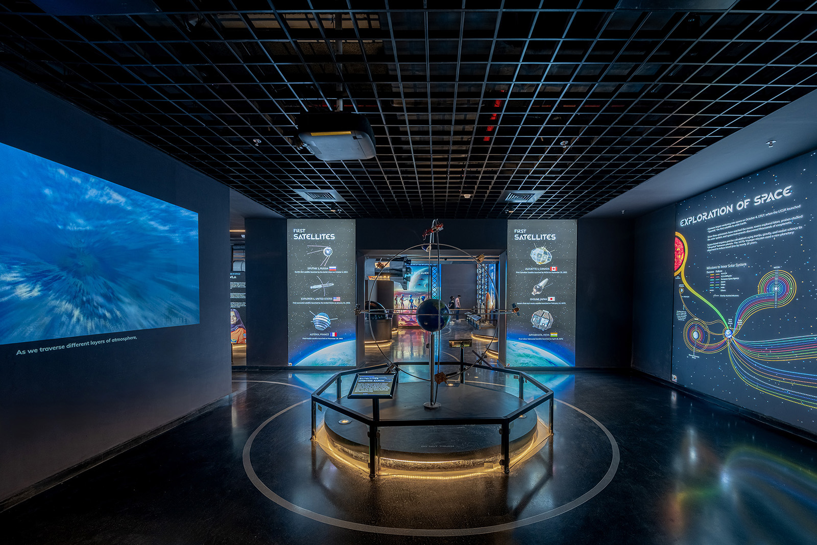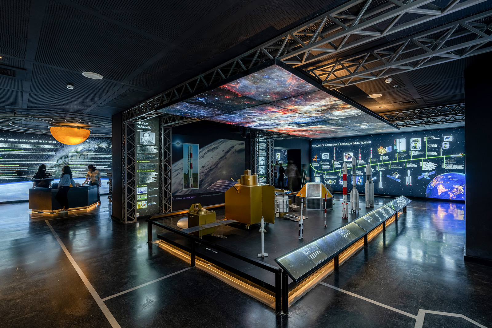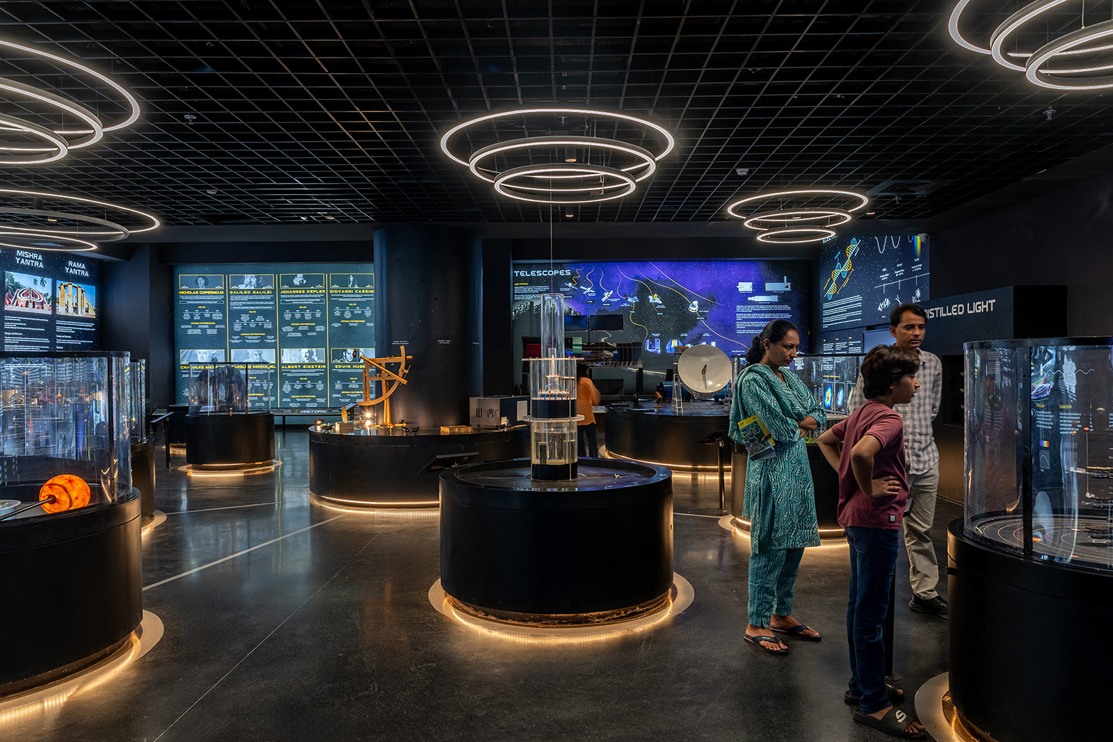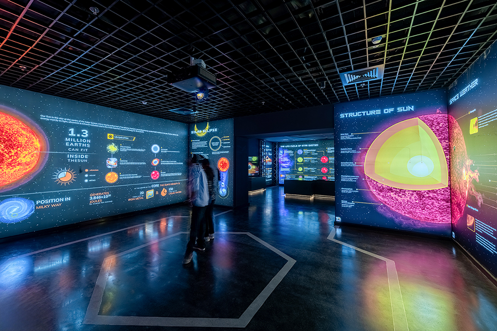 The galleries are categorised through a time lens as past history, present advancements and future projections of astronomy and space science where the dark interiors house lit-up exhibits and installations interspersed with informative audio-visual media interfaces to engage the visitor in an entertaining and enriching journey of education about our cosmos.