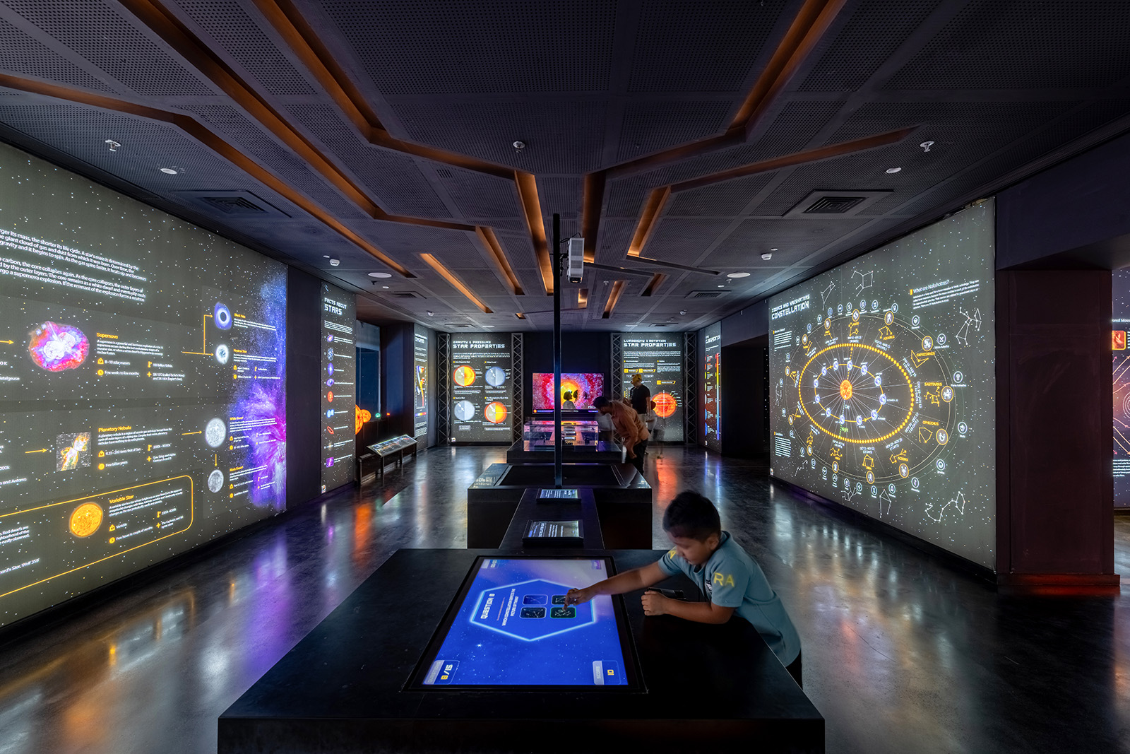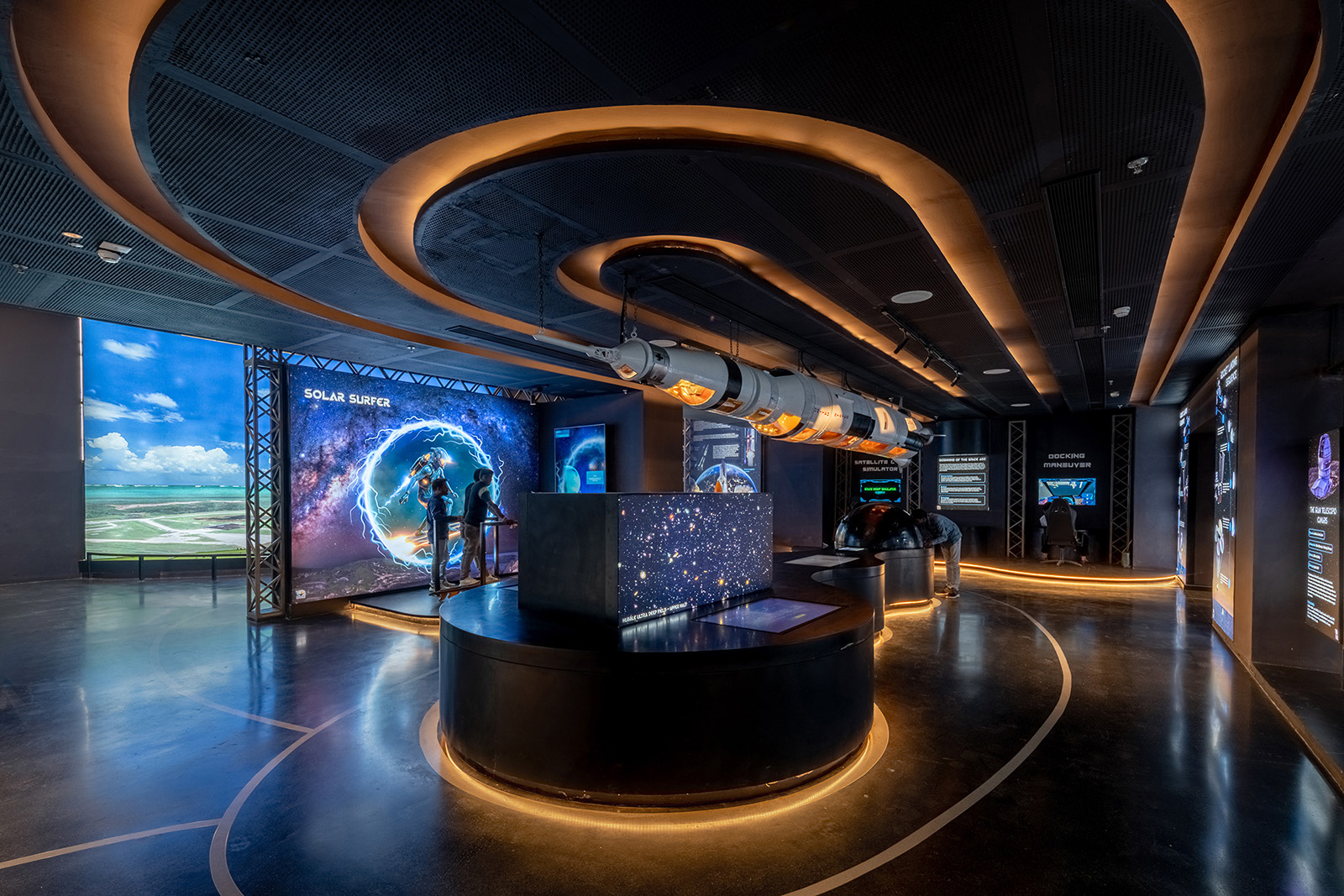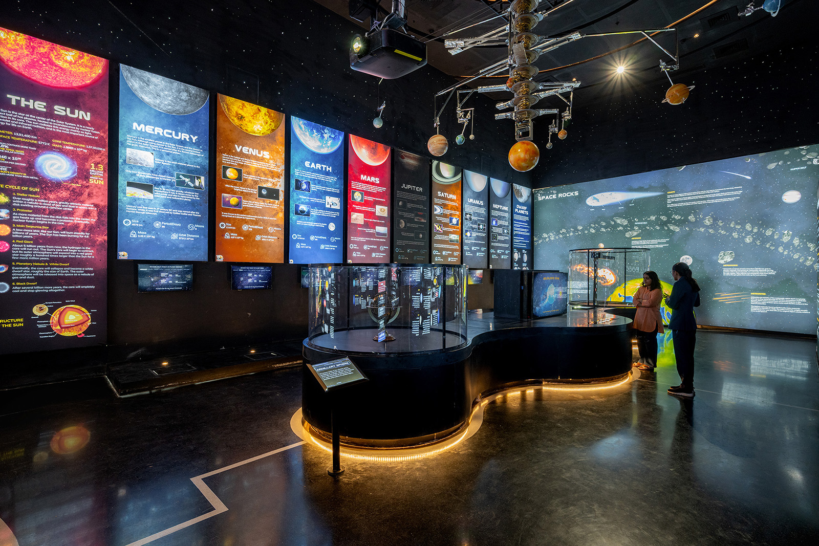 The galleries are categorised through a time lens as past history, present advancements and future projections of astronomy and space science where the dark interiors house lit-up exhibits and installations interspersed with informative audio-visual media interfaces to engage the visitor in an entertaining and enriching journey of education about our cosmos.