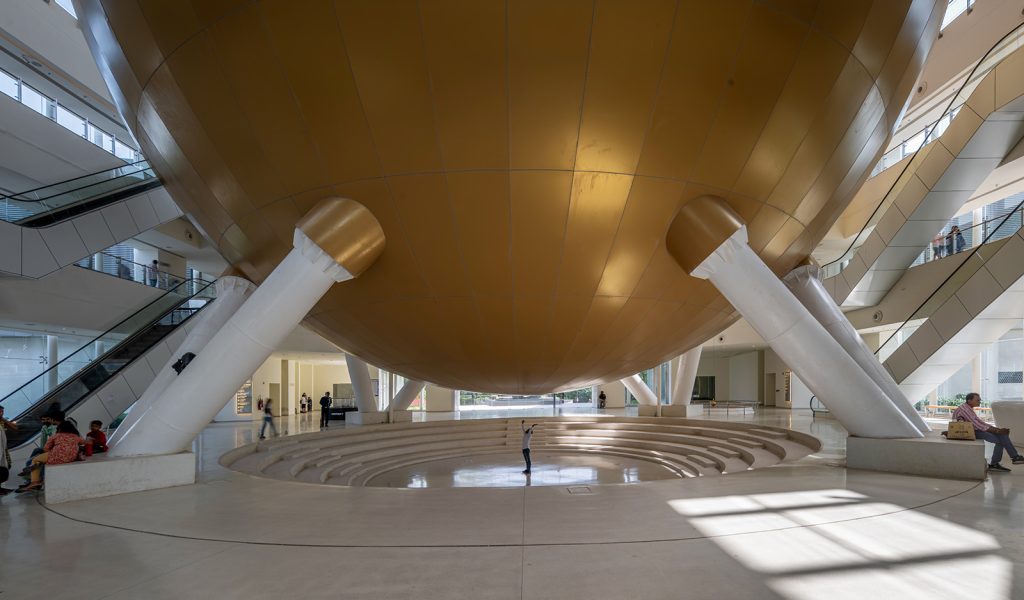 The massive globe hoisted at the atrium’s centre houses the planetarium accessed via a bridge at the upper level. The surrounding circulatory passages leading to various galleries at the upper levels overlook the central space where the eight planets suspended around the globe