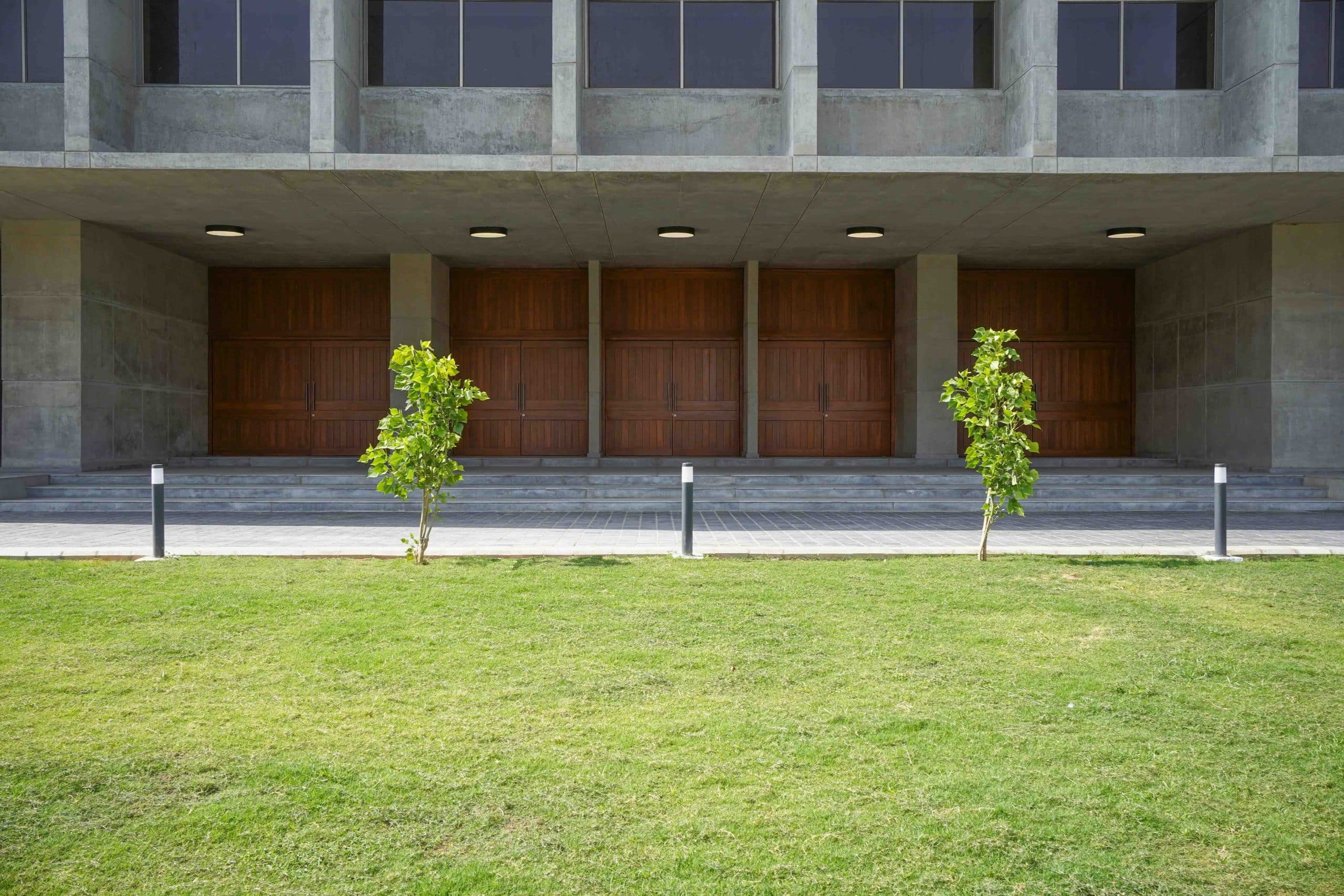 The building's front is graced with a verdant lawn, seamlessly integrated into the design, which guides the driveway and arrival plaza with an organic flow. The ramp at the rear leads to the basement, offering ample parking for both two-wheelers and four-wheelers.