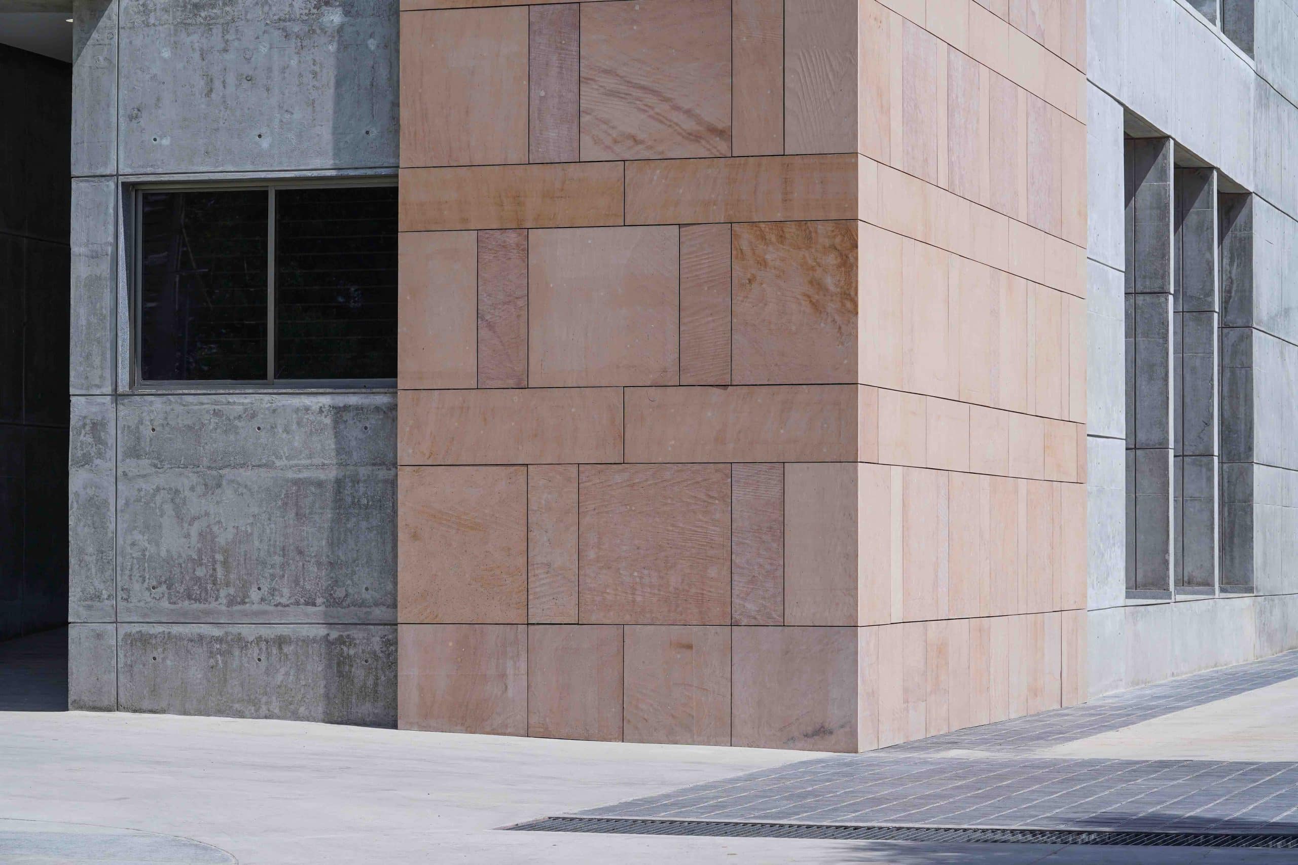 The exterior and interior materials seamlessly merge, creating a cohesive design narrative. Architectural exposed concrete harmonizes with the ethereal Jodhpur pink sandstone, radiating a blend of modernity and timeless elegance