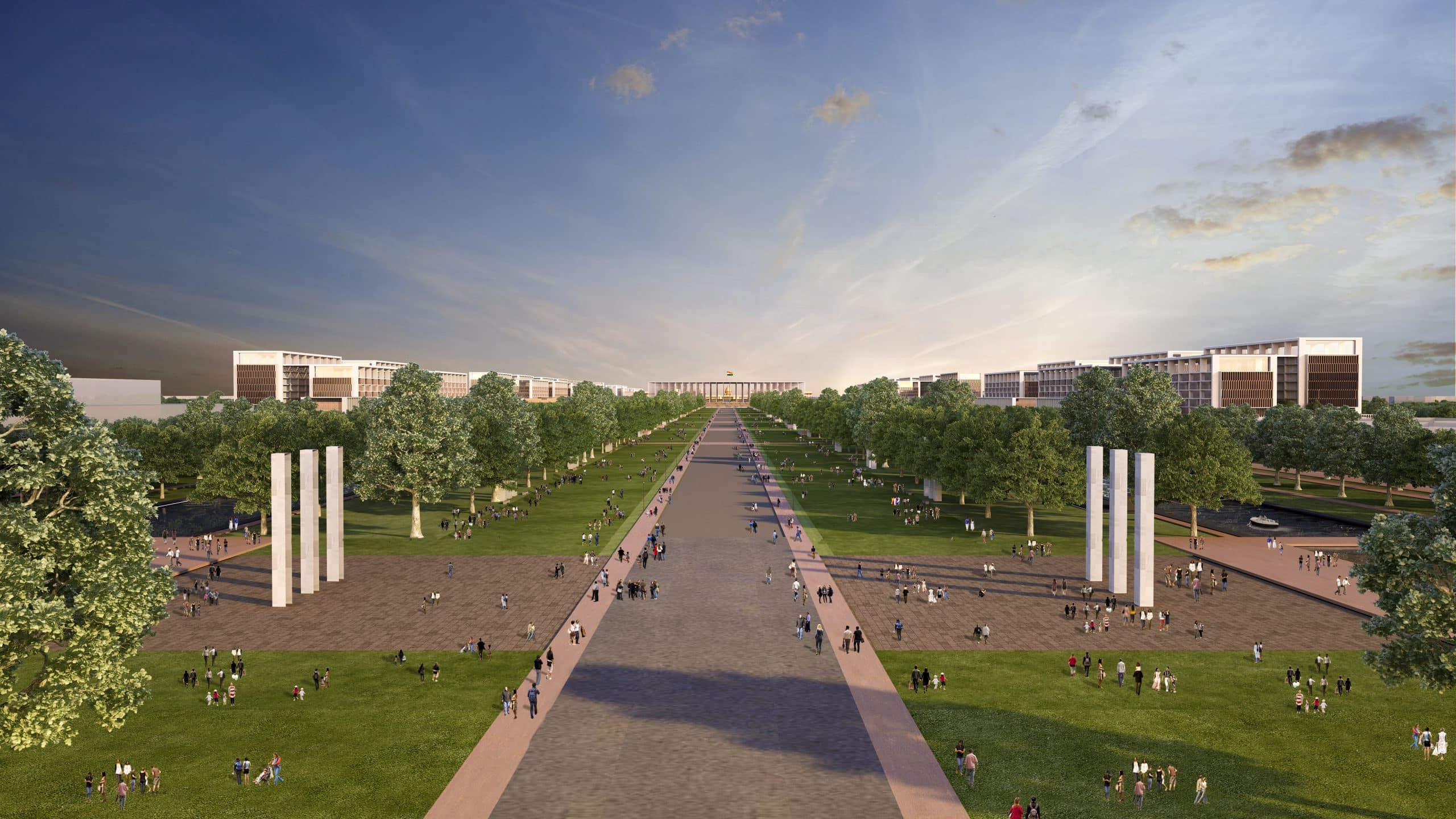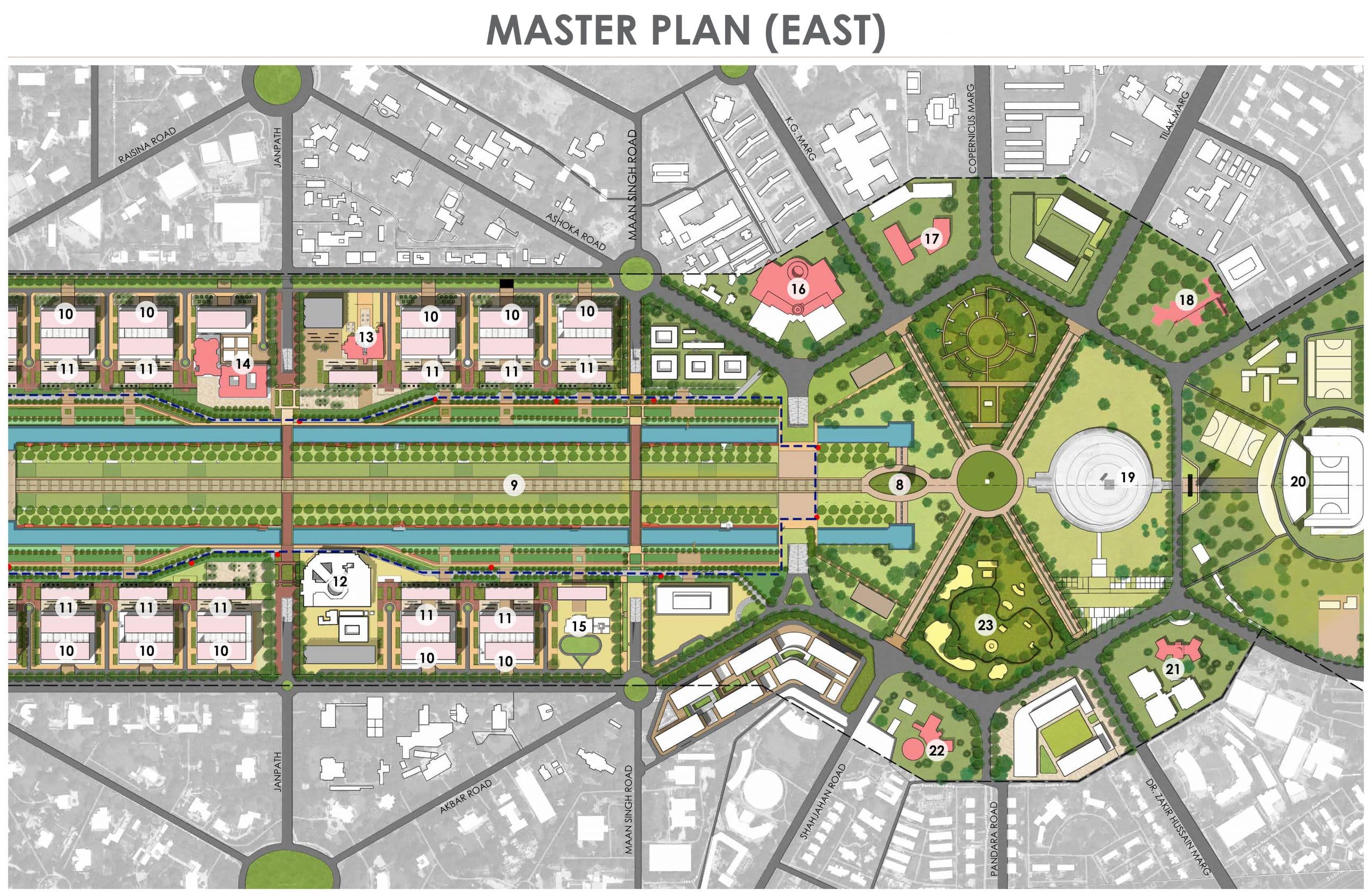 The architectural glory and historic significance of structures such as the old Parliament Building, North Block, South Block, India Centre for Arts, and others are deemed to be preserved by reprogramming them as museums of Indian democracy, library and archivals. Conservation of natural landscape by preserving avenue trees and existing flora while adding new ones, reactivating public spaces by enhancing streetscapes and open spaces are some of the green design tools. Incorporating water management strategies like percolation wells, rainwater harvesting and grey water recycling, harnessing solar energy, climate responsive design through building orientation, promoting non-motorized mobility by strengthening cycle/ shuttle/ NMT routes are some of the sustainability strategies employed. The entire master plan is designed to measure up to a Platinum rating level Green Vision while Parliament Complex is designed to be a Net Positive Energy Campus.