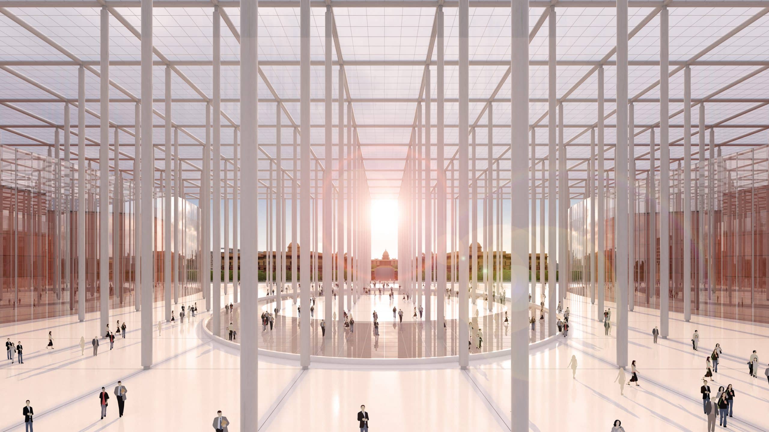 The prestigious project of the Union Government of India to revamp the existing parliament building for increased capacity and facilities, along with the surrounding governmental infrastructure along the Rajpath at New Delhi, saw four finalists shortlisted as part of 3 stage selection process through an international bidding process including this proposal from INI Design Studio. This Master Plan and design revolves around preserving and paraphrasing the existing heritage infrastructure in an increasingly contemporary and democratic articulation which renders it ready for challenges of the future. Having decided to preserve the existing parliament house located away from the central axis as a museum of democracy, the new Parliament House is proposed to be placed centrally on the grand main avenue, Rajpath, connecting India Gate at one end to Rashtrapati Bhavan at the rear end. This placement highlights the functional centrality of the Parliament to the Nation as its Temple of Democracy. The new building visually references ancient Indian temples with its massive pillared portico, albeit modernized with steel columns holding up a solar BIPV glass canopy. Under this, two elliptical volumes are sculpted in to accommodate the two houses of parliament, Rajya Sabha and Lok Sabha with the Central Hall between them framing a poignant view of the Rashtrapati Bhavan on one side and of India Gate on the other through the maze of its pillars.