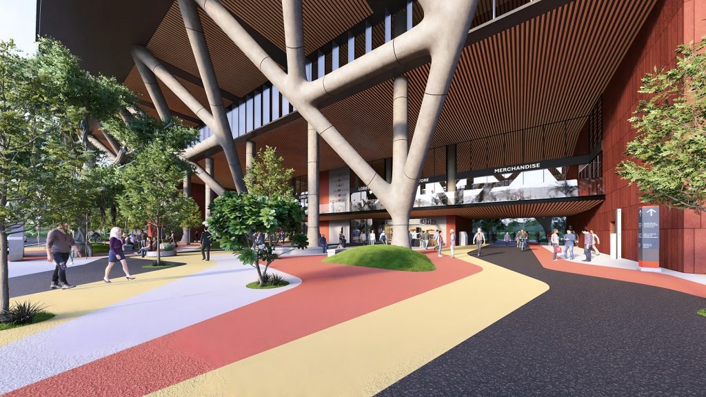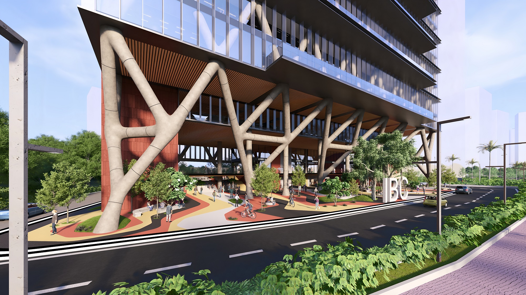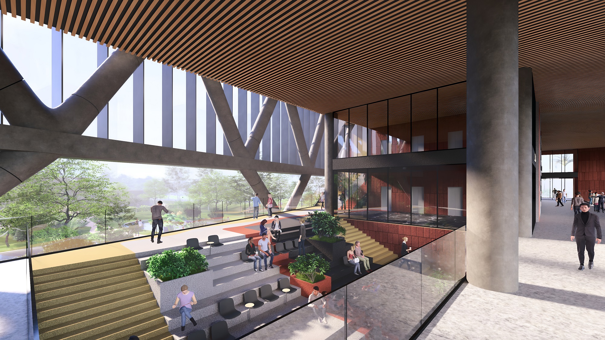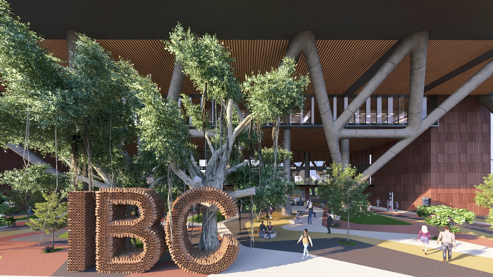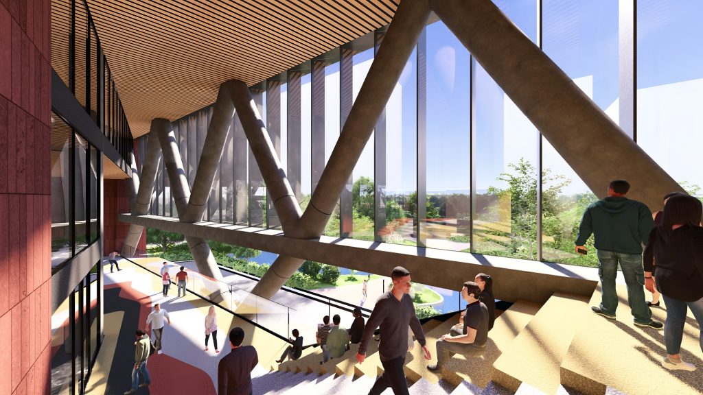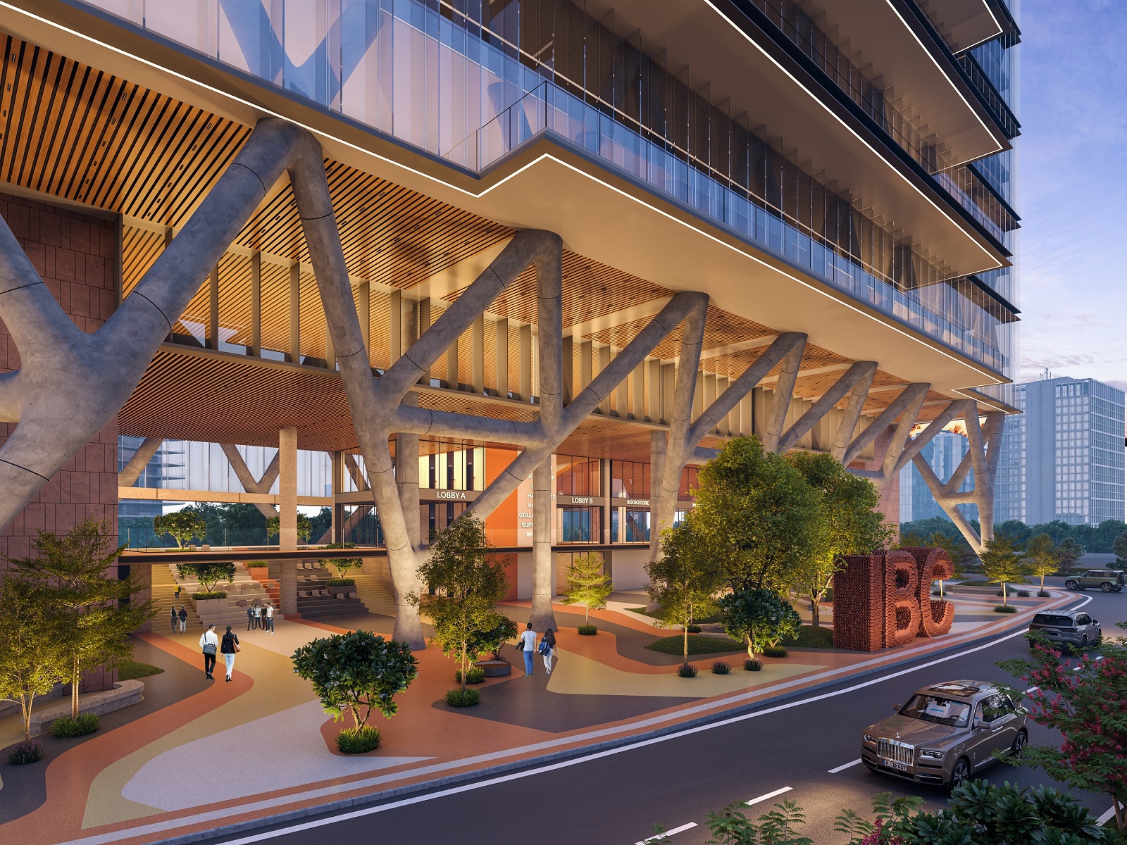 triple-height entry plaza marks the threshold of intellectual ascent, anchored by tree-like columns that rise from the ground as symbolic roots. These evolve into a branching diagrid structure above—interlacing space, structure, and the layered disciplines of a contemporary university. The metaphor is spatialized into a living framework where tradition and aspiration coalesce.