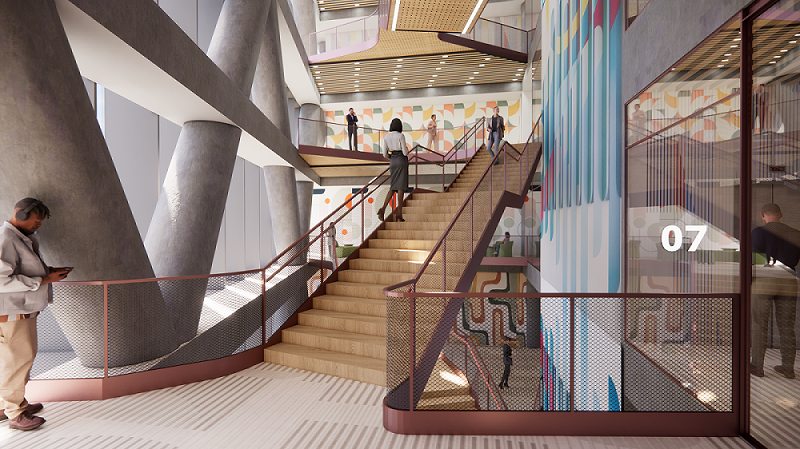 The massing evolves from a maximum permissible volume into a rationalized form shaped by performance and precision. Central and perimeter cores enhance structural and thermal efficiency. A north-facing atrium, animated by the social staircase, creates a luminous void for vertical interaction and reflection. Volumetric shifts generate social terraces, culminating in a double-height rooftop commons that opens to the skyline.