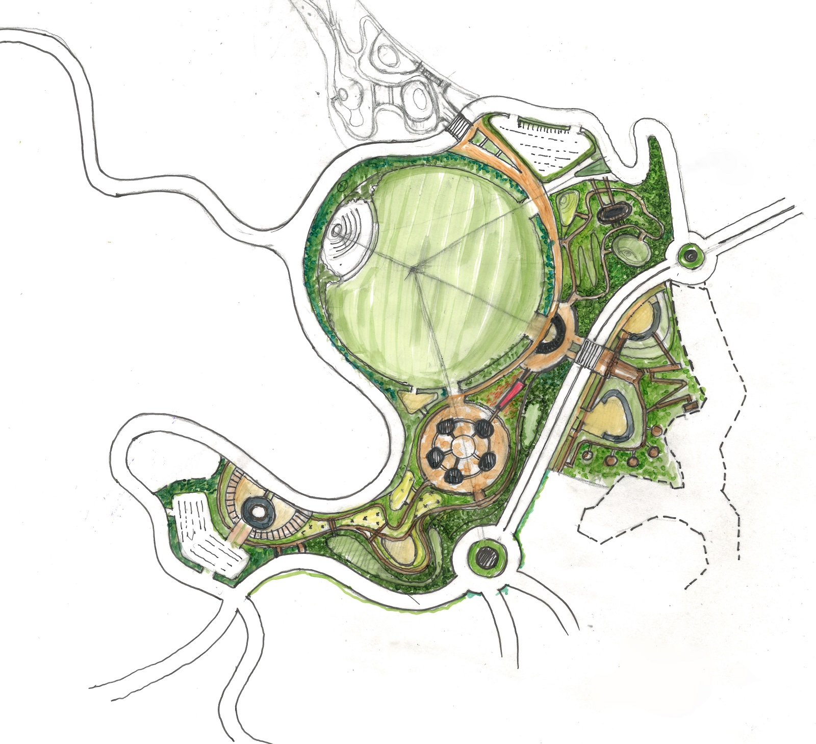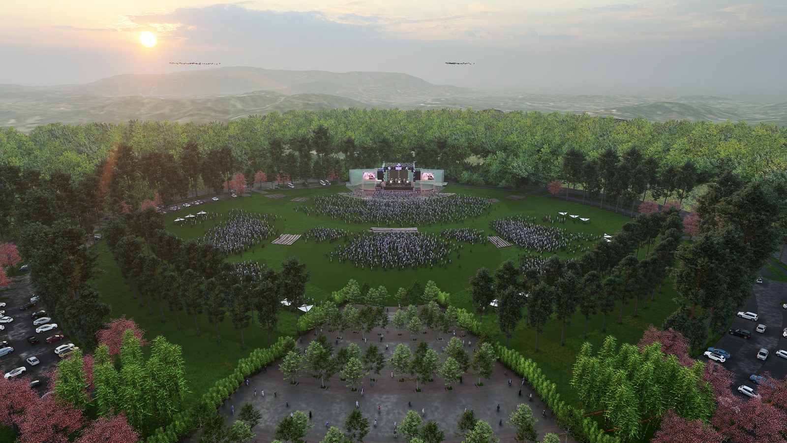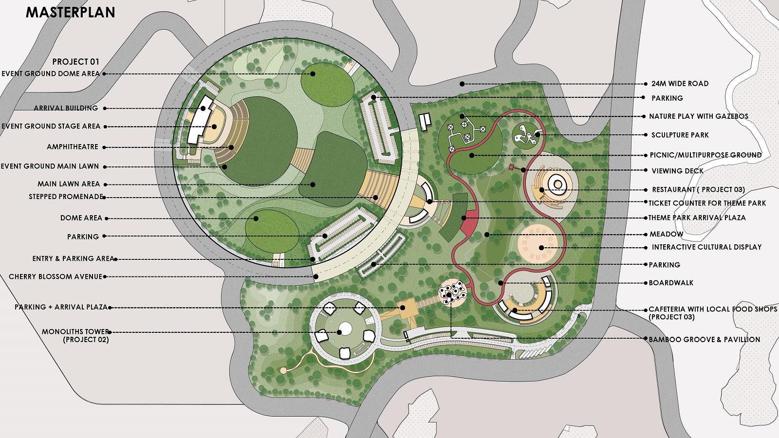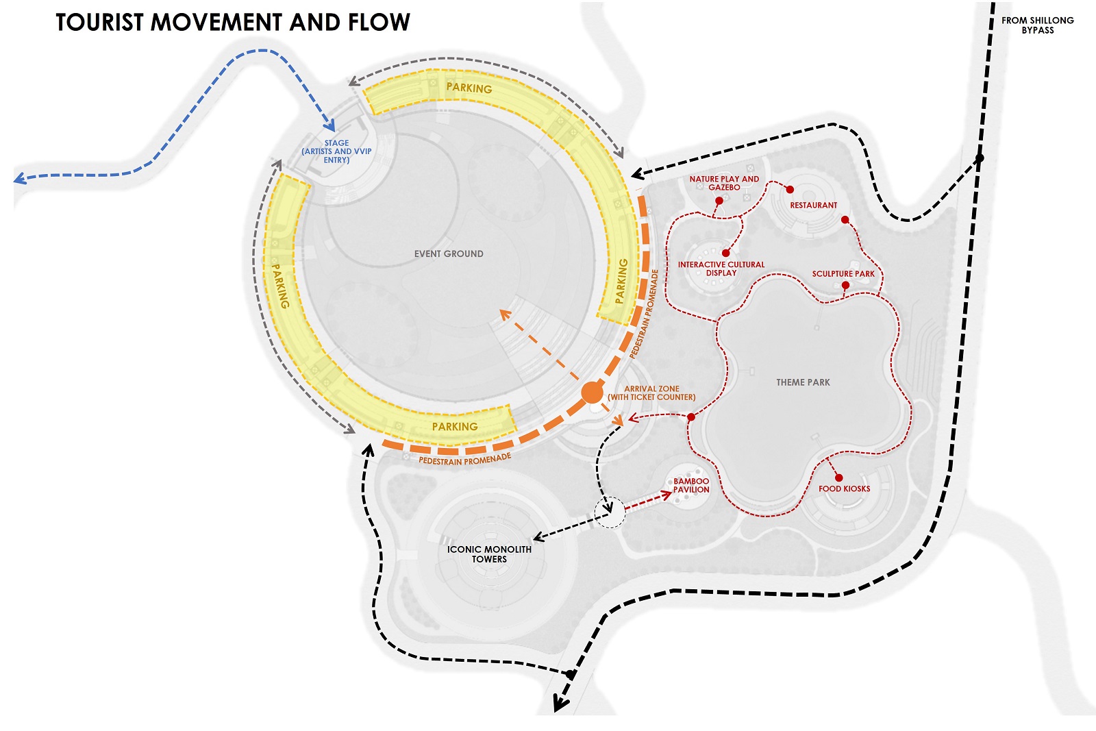Located between the Shillong Bypass and Knowledge City, the destination is planned as a self-sustaining tourism node within a larger 874-acre masterplan. The site weaves together culture and celebration, nature and performance, adventure and reflection—offering visitors a dynamic, multifaceted experience. Spanning across public parks, hotels, amphitheatres, a convention centre, and themed recreational zones, the layout enables both high-energy festivals and serene retreats within the same ecological frame.