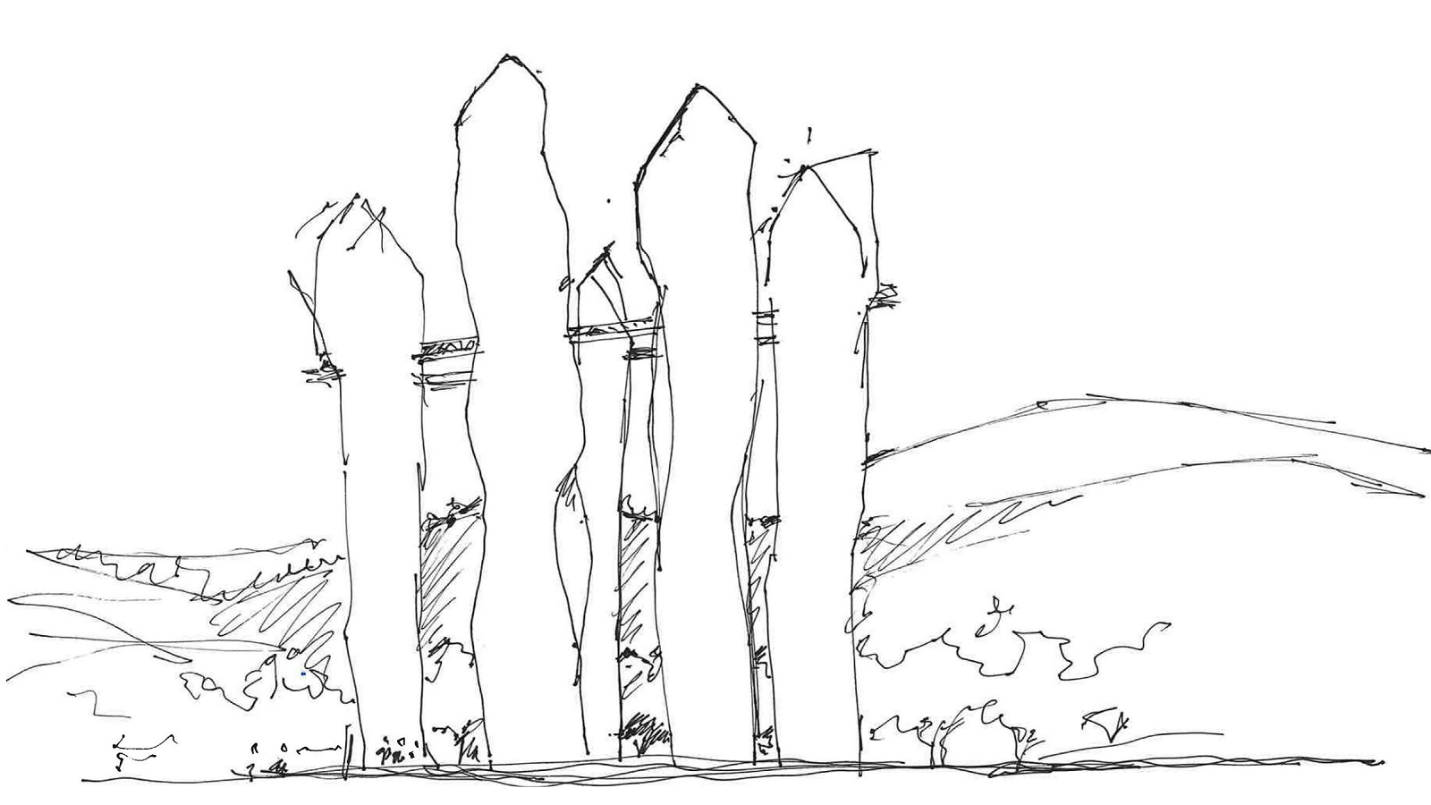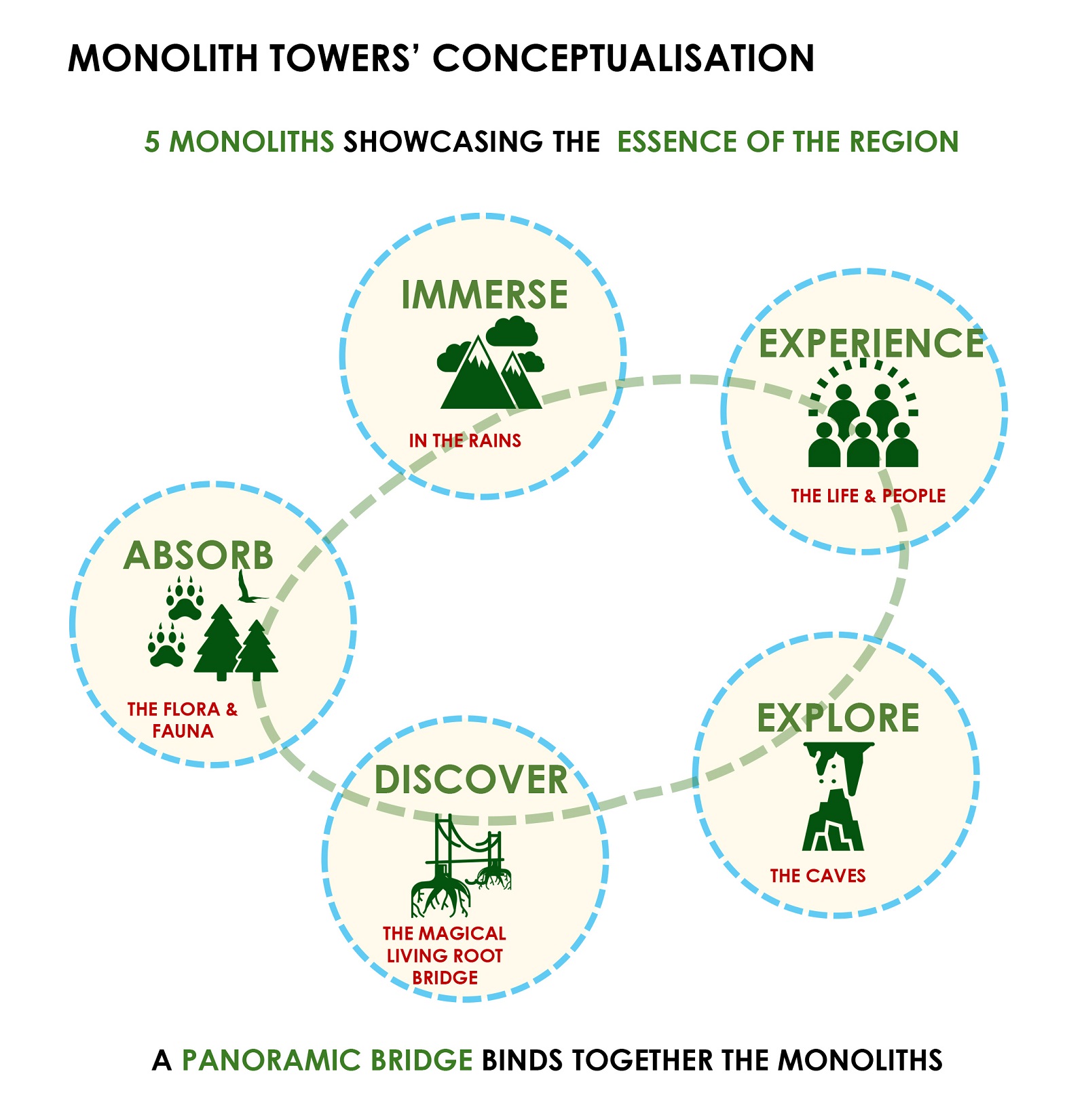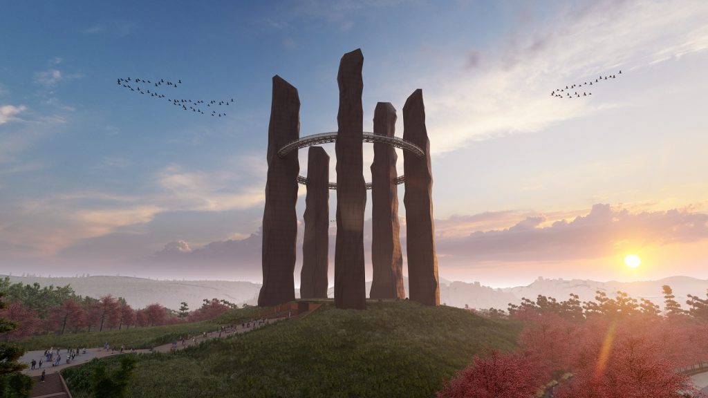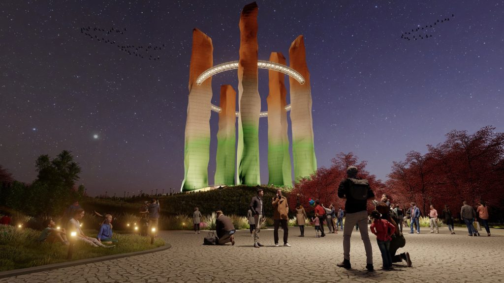 Meghalaya’s traditional monoliths—towering stone markers that serve as collective memorials and sacred artefacts of the Khasi and Jaintia tribes. These towers rise as five slender, faceted forms, each varying in height (from 93m to 120m), and collectively connected through a panoramic sky bridge. The bridge not only offers sweeping views of the surrounding valleys but also forms an elevated cultural circuit—housing galleries, lounges, and curated experiences.