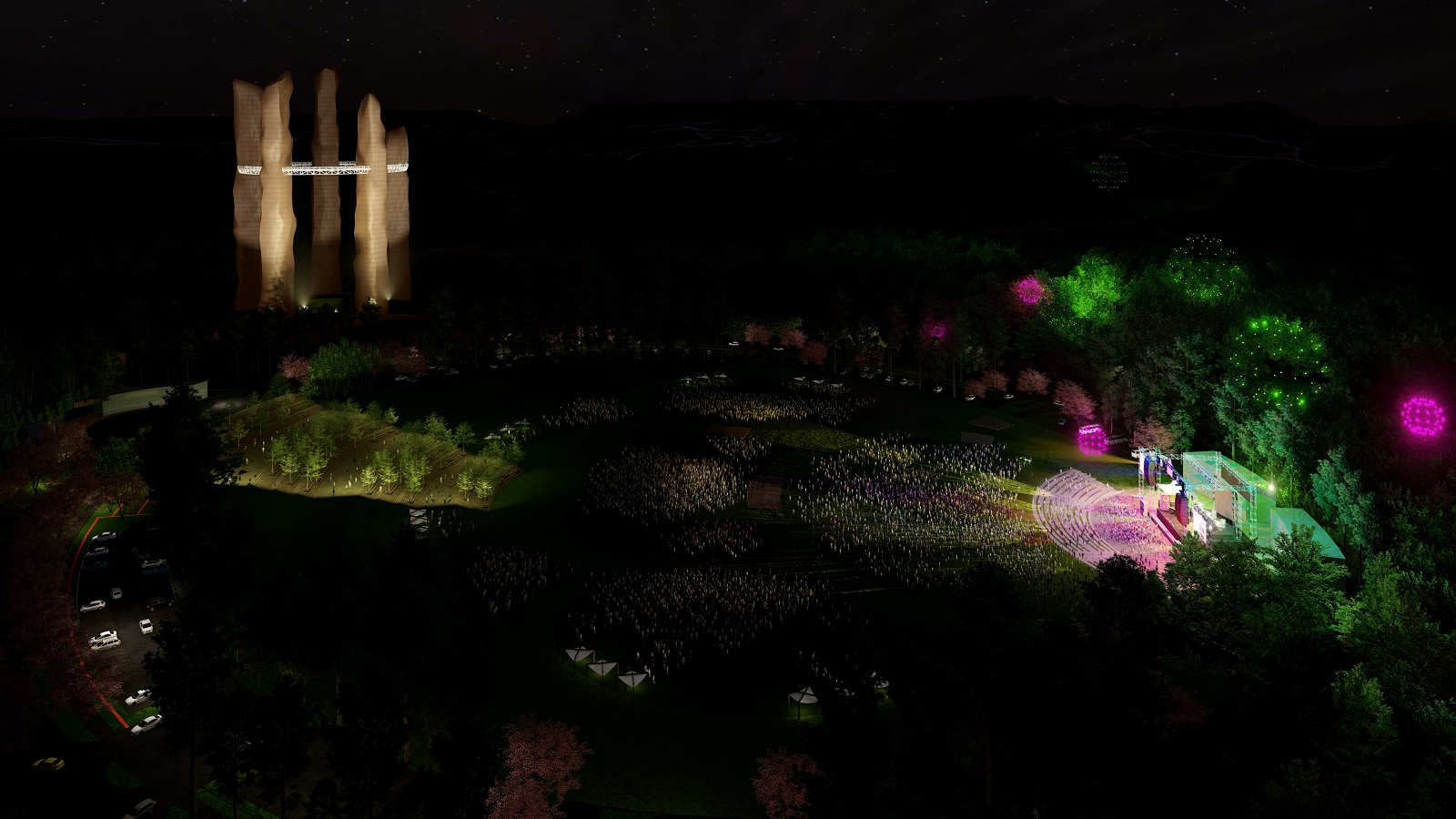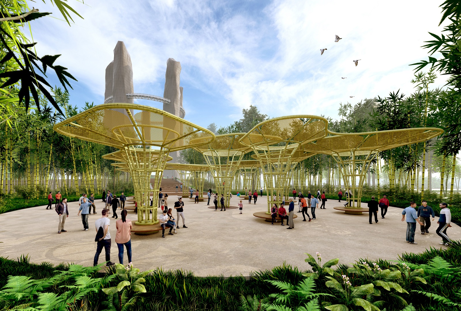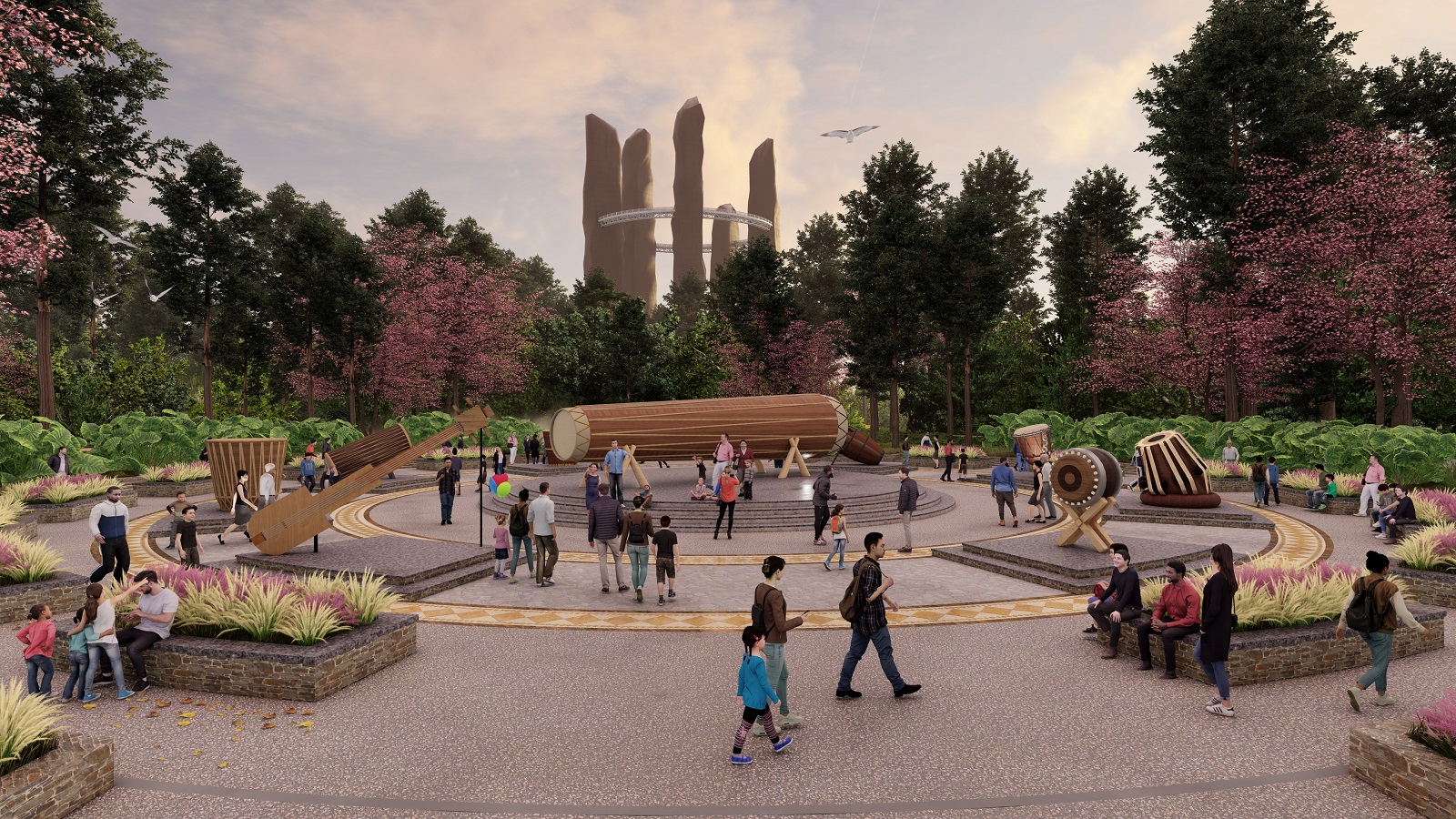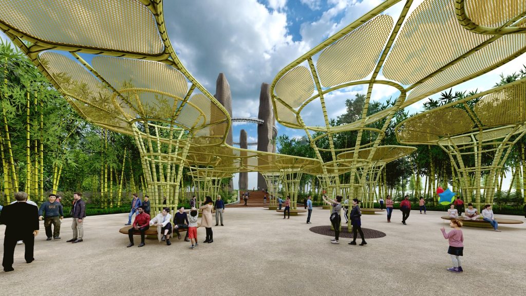At the core of the site lies a 48.6-acre tourism zone anchored by the Meghalayan Theme Park, an expansive Event Ground, and the cluster of five Iconic Towers. Together, these elements compose a monumental ensemble that celebrates both land and legacy. The public realm is animated by cherry blossom avenues, stepped promenades, bamboo pavilions, sculpture parks, and cultural trails that meander through curated meadows and groves—turning every corner into an interactive moment.