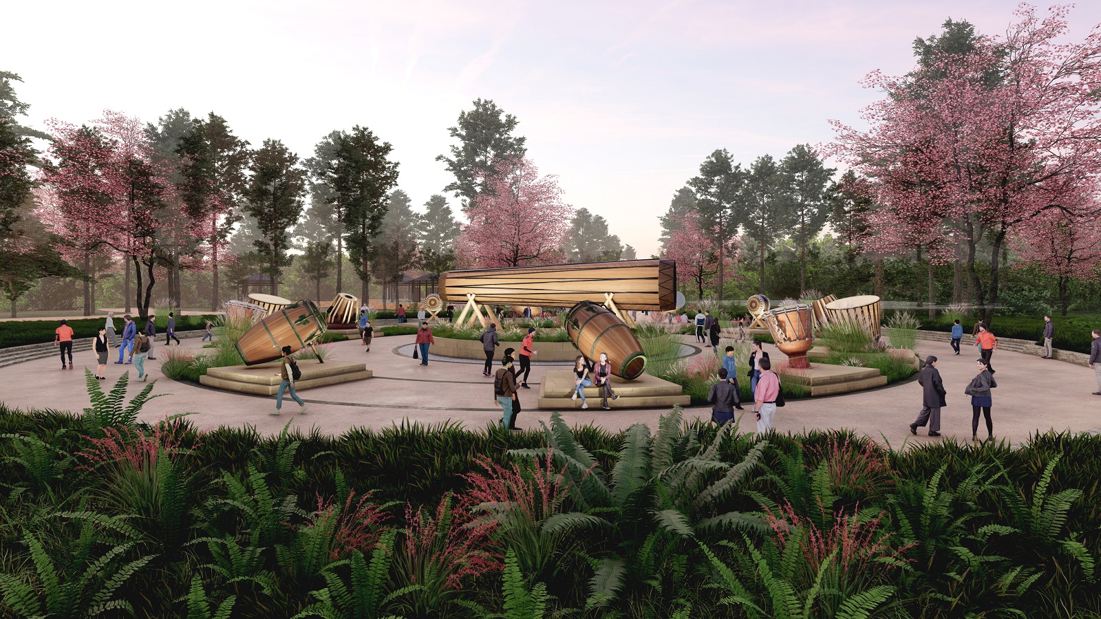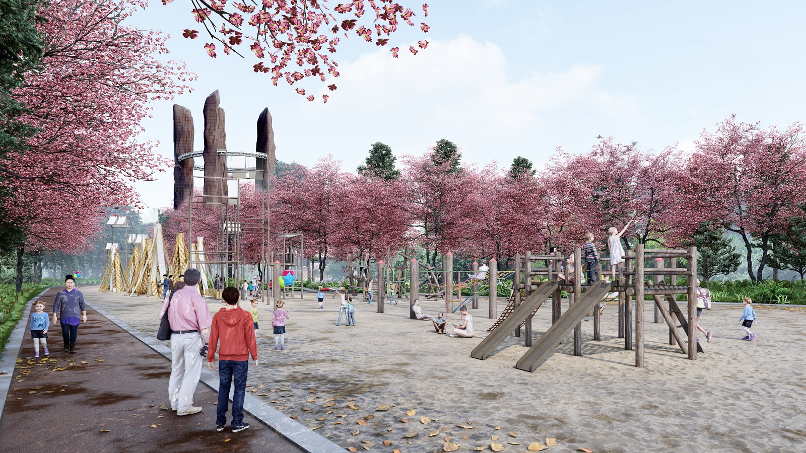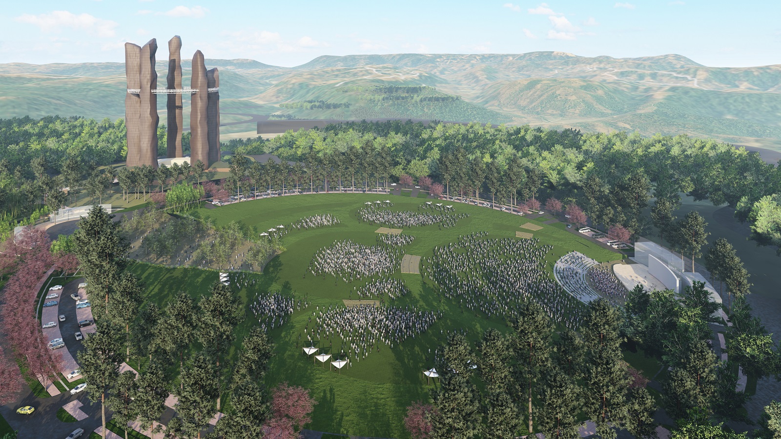 At the core of the site lies a 48.6-acre tourism zone anchored by the Meghalayan Theme Park, an expansive Event Ground, and the cluster of five Iconic Towers. Together, these elements compose a monumental ensemble that celebrates both land and legacy. The public realm is animated by cherry blossom avenues, stepped promenades, bamboo pavilions, sculpture parks, and cultural trails that meander through curated meadows and groves—turning every corner into an interactive moment.