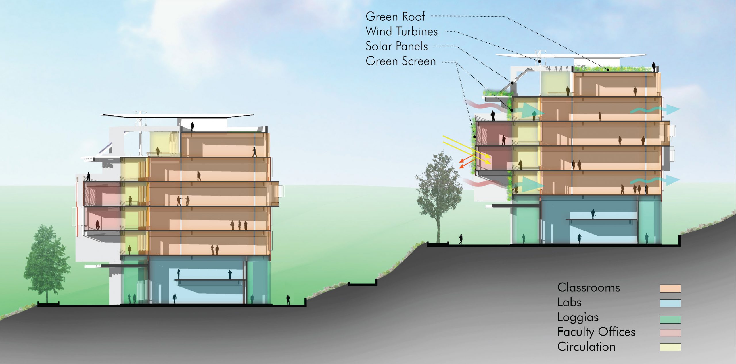 The architectural design is integrated with many passive and active systems of resource and energy management as well as climate response with an affirmative commitment to sustainable, green design practices. These include rain water harvesting and recycling of grey water, generation of energy from alternative sources such as solar BIPV systems, wind turbines, effective shading and daylighting devices, and others. While the natural green scape and biodiversity have been preserved to the greatest possible extent, greening has been enhanced on the built structures as well by means of green roofs and green-covered trellises.