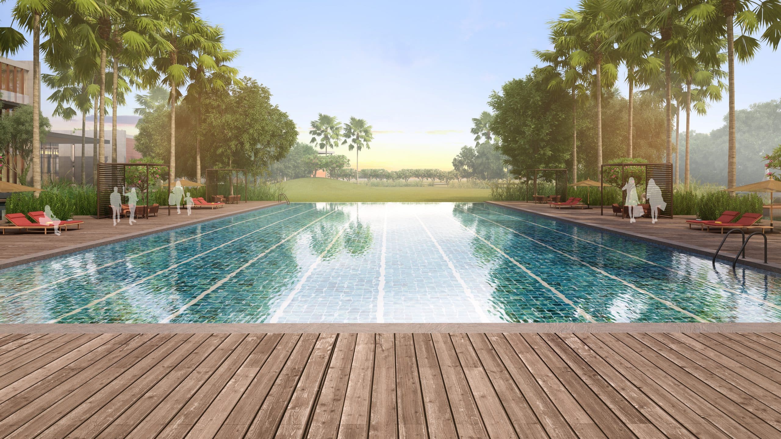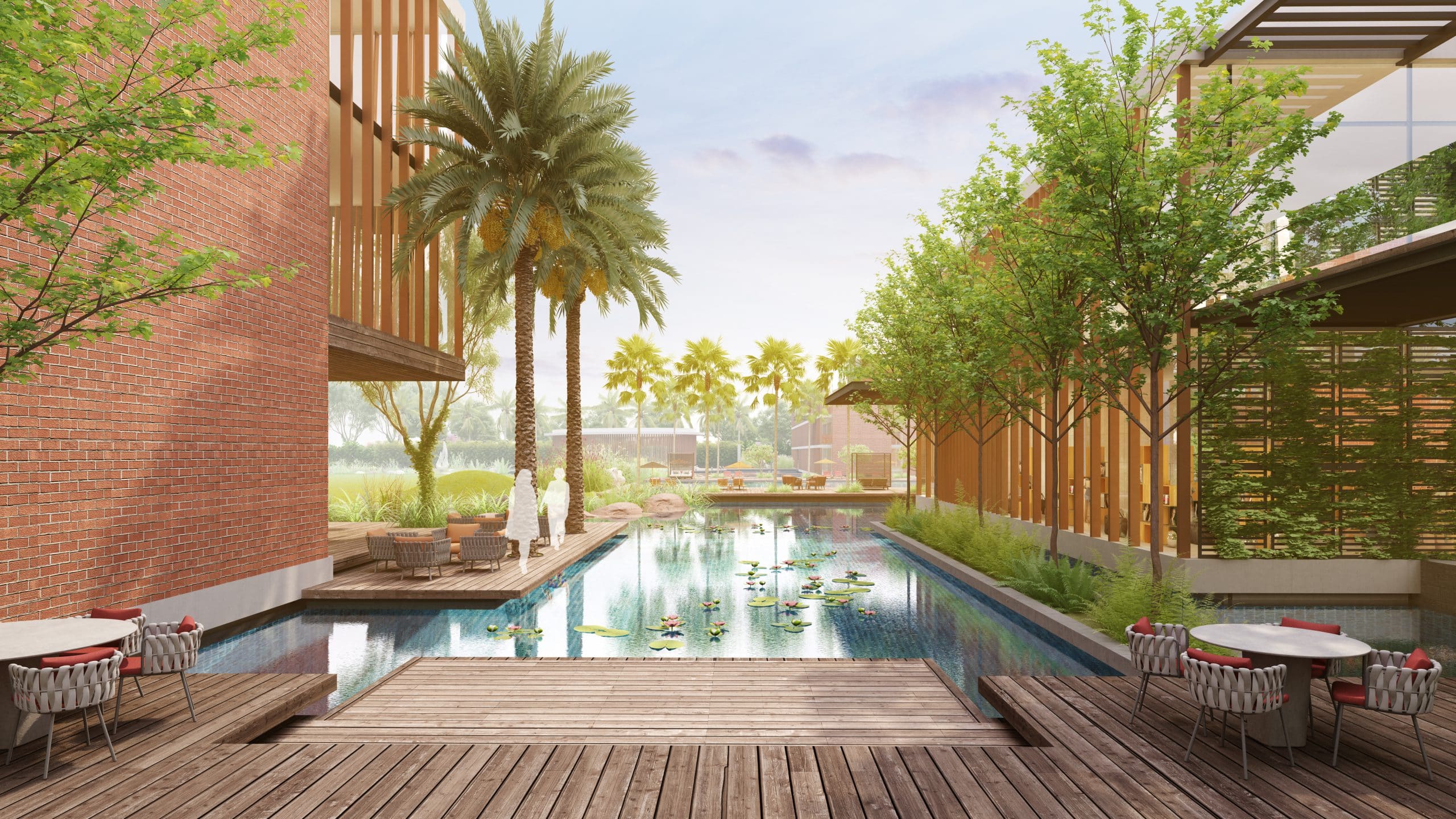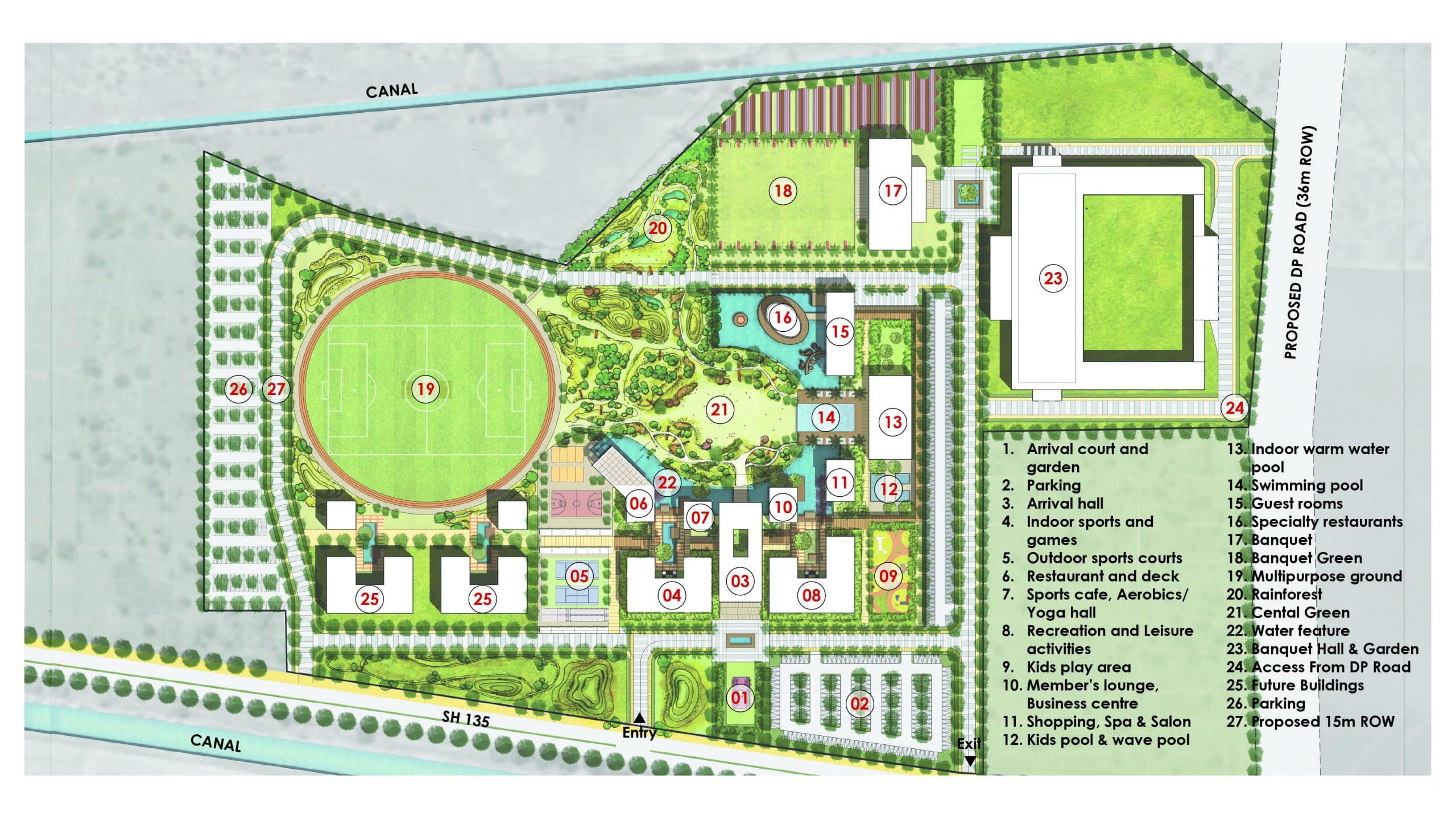 An exhaustive programme that includes recreation/ leisure activities, indoor & outdoor sports facilities, fitness and yoga centre, restaurant & cafe, guestrooms for visitor accommodation, shopping, spa, salon, kids’ play, members’ lounge, business centre, multi-purpose ground, swimming pool, water features with deck lounging, and many more elements has been arranged around the southern and western edges of a central green which extends to the north-eastern end into a created rainforest.
