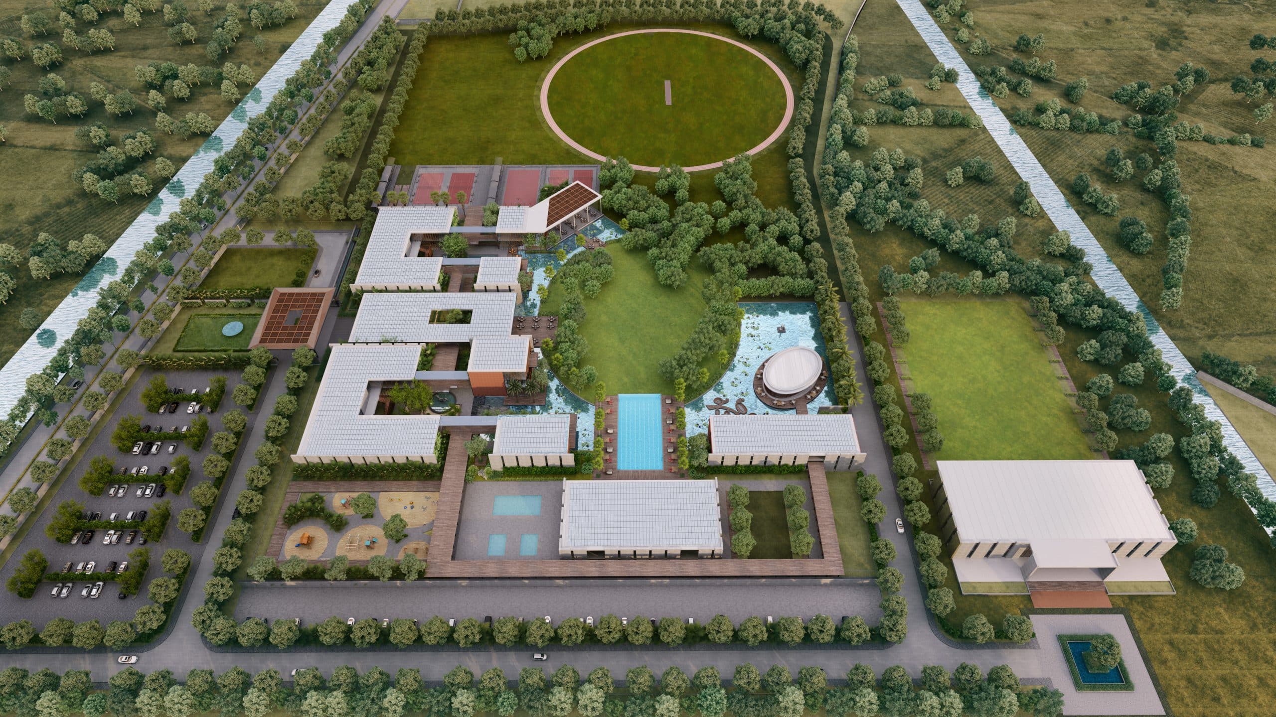 The core concept of the project revolves around the creation of immersive experiences within an exhaustive range of various types of landscapes. While the interweave of the club buildings with green and blue elements of the central park permeates calm meditative energy, the forest beyond with woody trails, grassy mounds, tree thickets interspersed with seating offer another type of natural experience. The outdoor sports ground with jogging/ cycling tracks along its perimeter as well as a variety of sports courts offer yet another opportunity of pursuing fitness and health in natural surroundings.