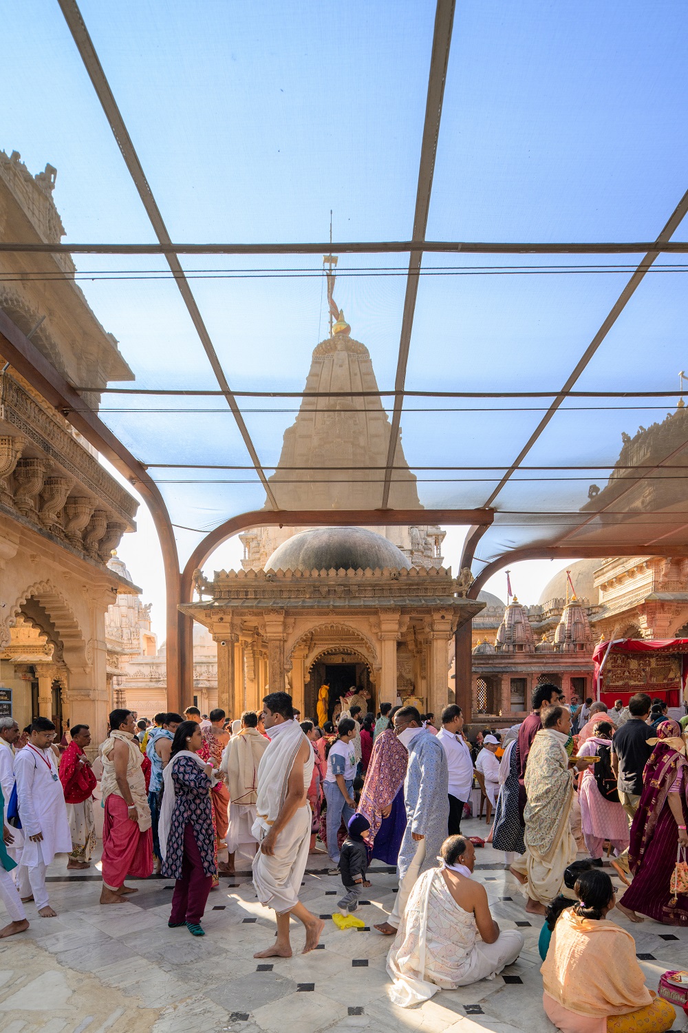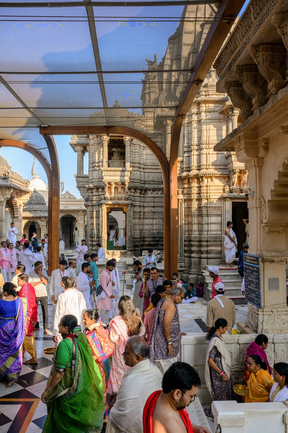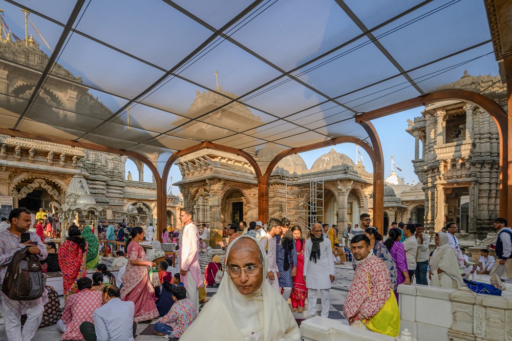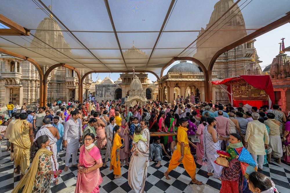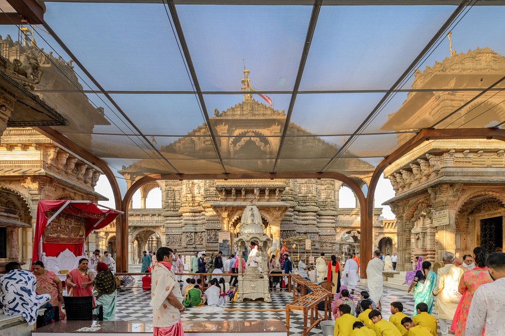 Designed as a column-free tensile structure, the lightweight and durable Rang Mandap shields devotees from the elements while maintaining optimal natural light and ventilation. The structure allows for decorative lighting without obstructing the view of the temples, thus preserving the sacred vista. The column-free solution prevents any damage to the existing flooring while facilitating easy circulation.