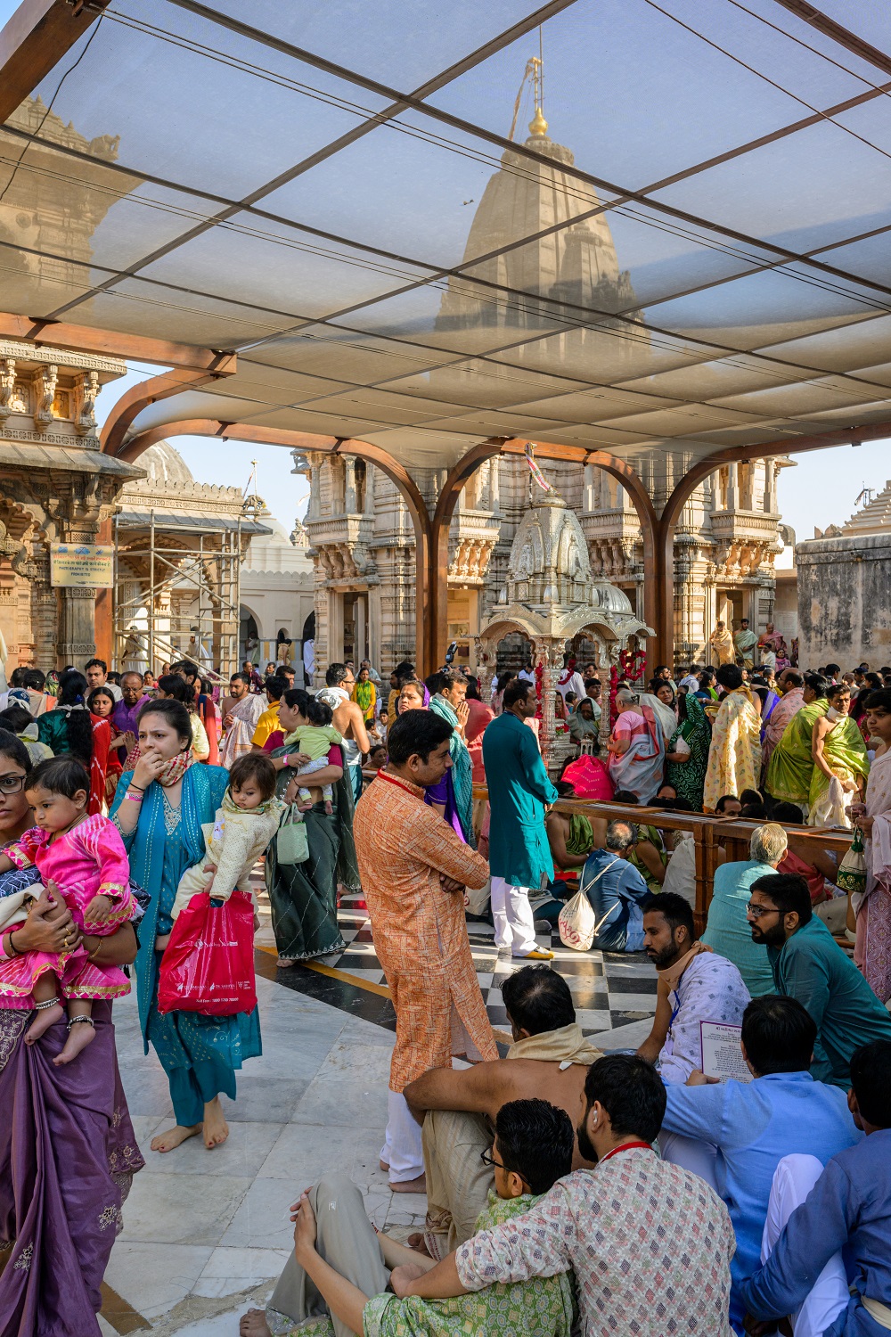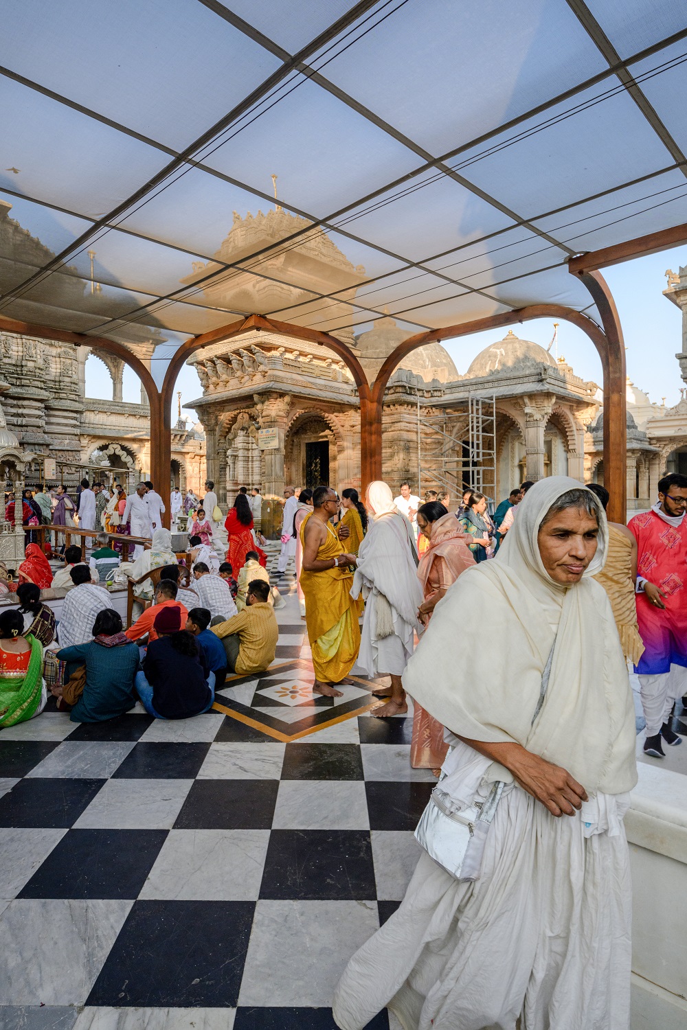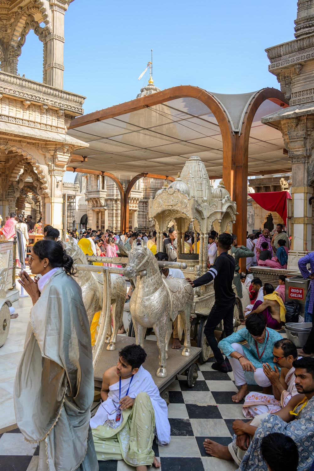 Designed as a column-free tensile structure, the lightweight and durable Rang Mandap shields devotees from the elements while maintaining optimal natural light and ventilation. The structure allows for decorative lighting without obstructing the view of the temples, thus preserving the sacred vista. The column-free solution prevents any damage to the existing flooring while facilitating easy circulation.