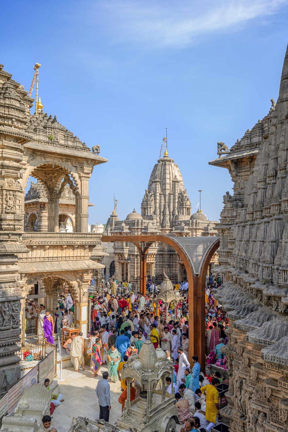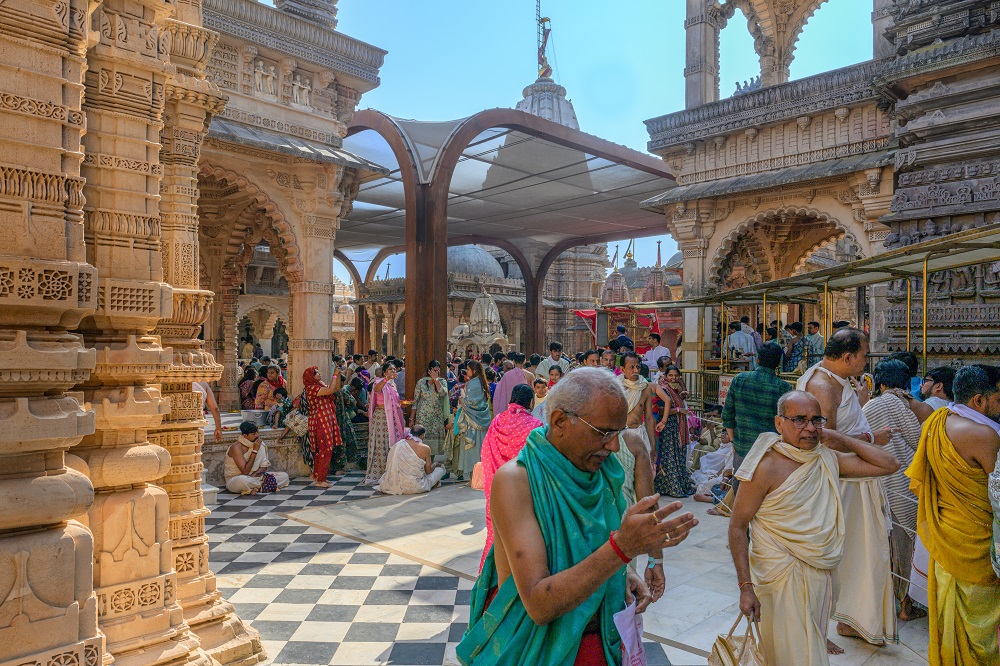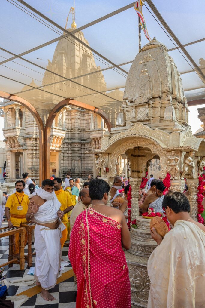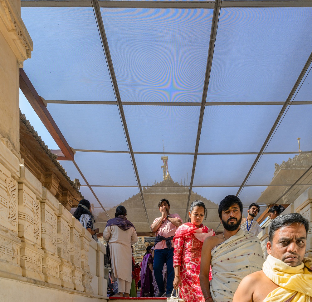 A key aspect of the design is ensuring the uninterrupted darshan (viewing) of the temples’ shikhar (spire) and the sky, which hold profound spiritual and symbolic significance in Hindu and Jain traditions. The Rang Mandap is designed to frame the towering shikhar against the open sky, preserving the essence of spiritual connection and aspiration for all devotees. The shikhar symbolizes the connection between the earthly and divine realms, and by maintaining clear sightlines to the sky, the design allows pilgrims to experience the transcendental power of this sacred architecture. The open sky above the shikhar represents infinity and boundlessness, reminding visitors of their spiritual journey toward self-realization and liberation (moksha). The act of gazing upon the shikhar and the sky is considered purifying, believed to cleanse the soul and elevate the seeker’s consciousness.