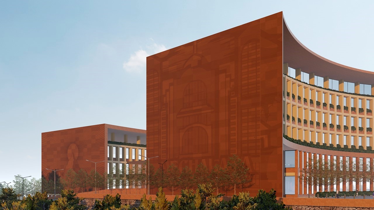The architectural vocabulary is shaped by principles of compactness, context, and monumentality, expressed through bold geometries, strong axiality, and locally rooted material articulation. A central arrival plaza leads to a grand stepped forecourt—both civic stage and cultural threshold—while the built form unfolds in concentric rings with courtyards, shaded