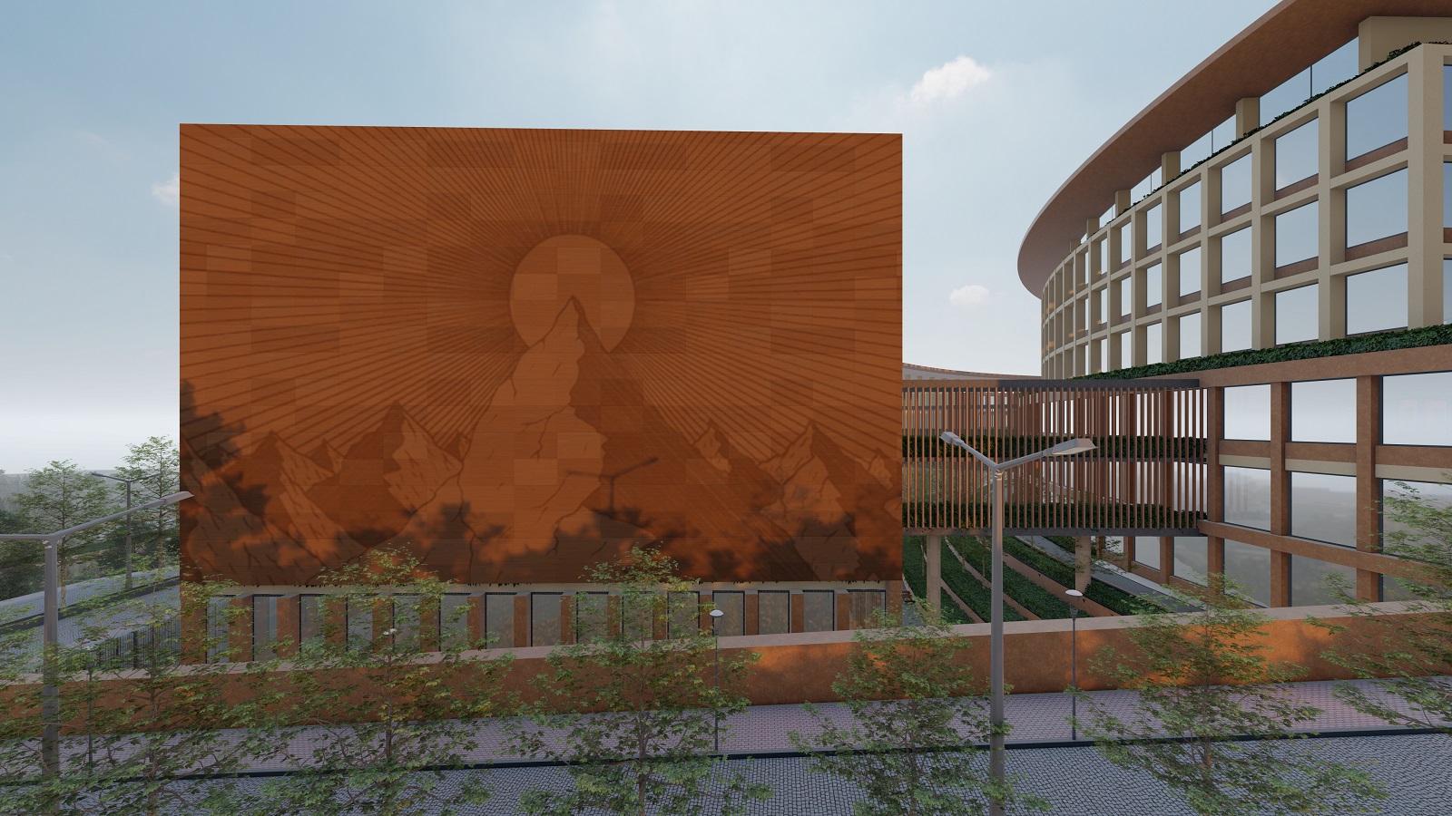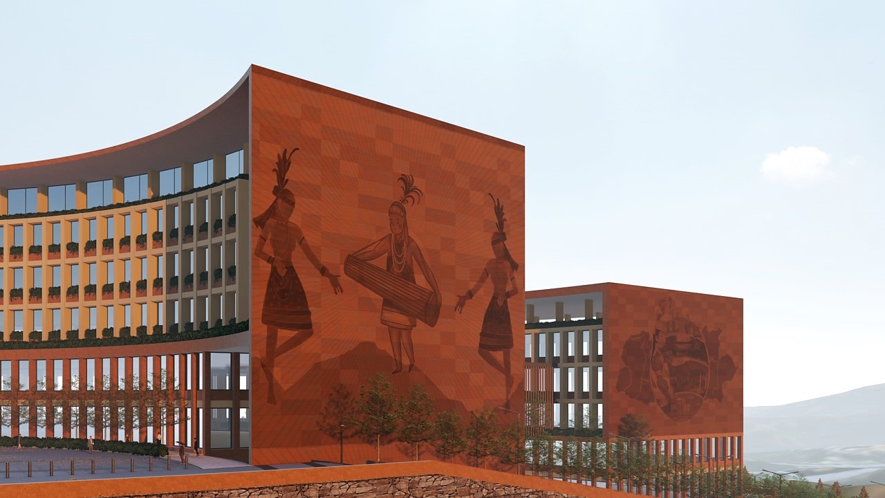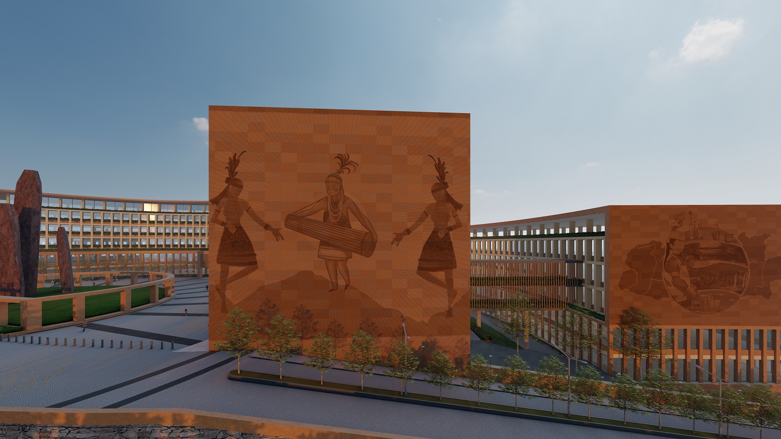 corridors, and bridge connectors facilitating inter-departmental flow. The facades integrate stone jaalis patterned on traditional weaves, bamboo and cane-inspired screens, and murals depicting the Khasi, Jaintia, and Garo tribes—transforming the complex into a contemporary institution that reflects Meghalaya’s identity through craft, climate-responsiveness, and symbolism.