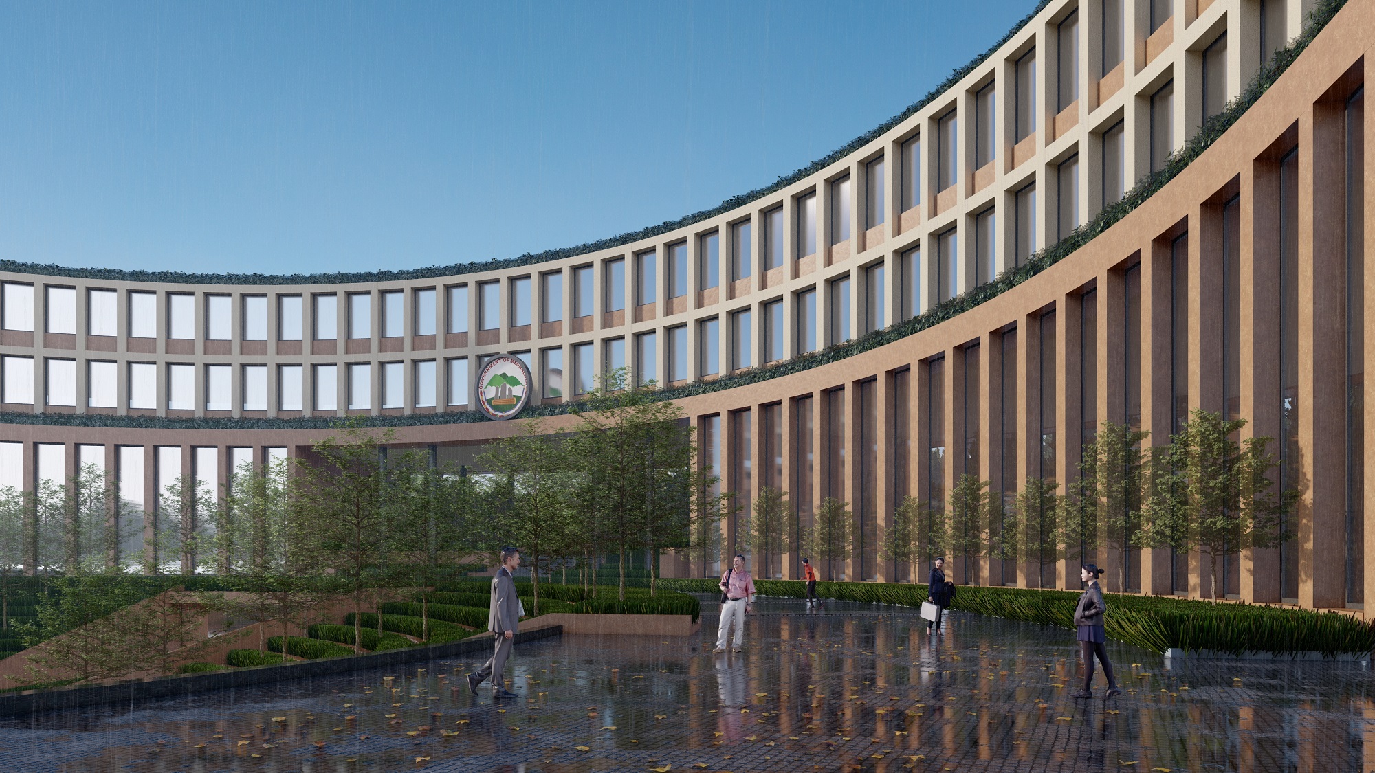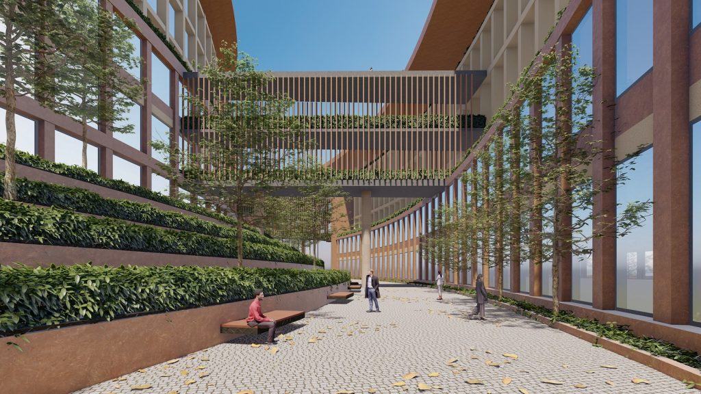 philosophy of “minimum footprint, maximum resilience,” the planning incorporates climate-responsive orientation, solar energy generation, water-sensitive landscaping, and material efficiency. Green courts, rooftop gardens, and shaded pathways thread through the site, creating a rhythm of work, pause, and