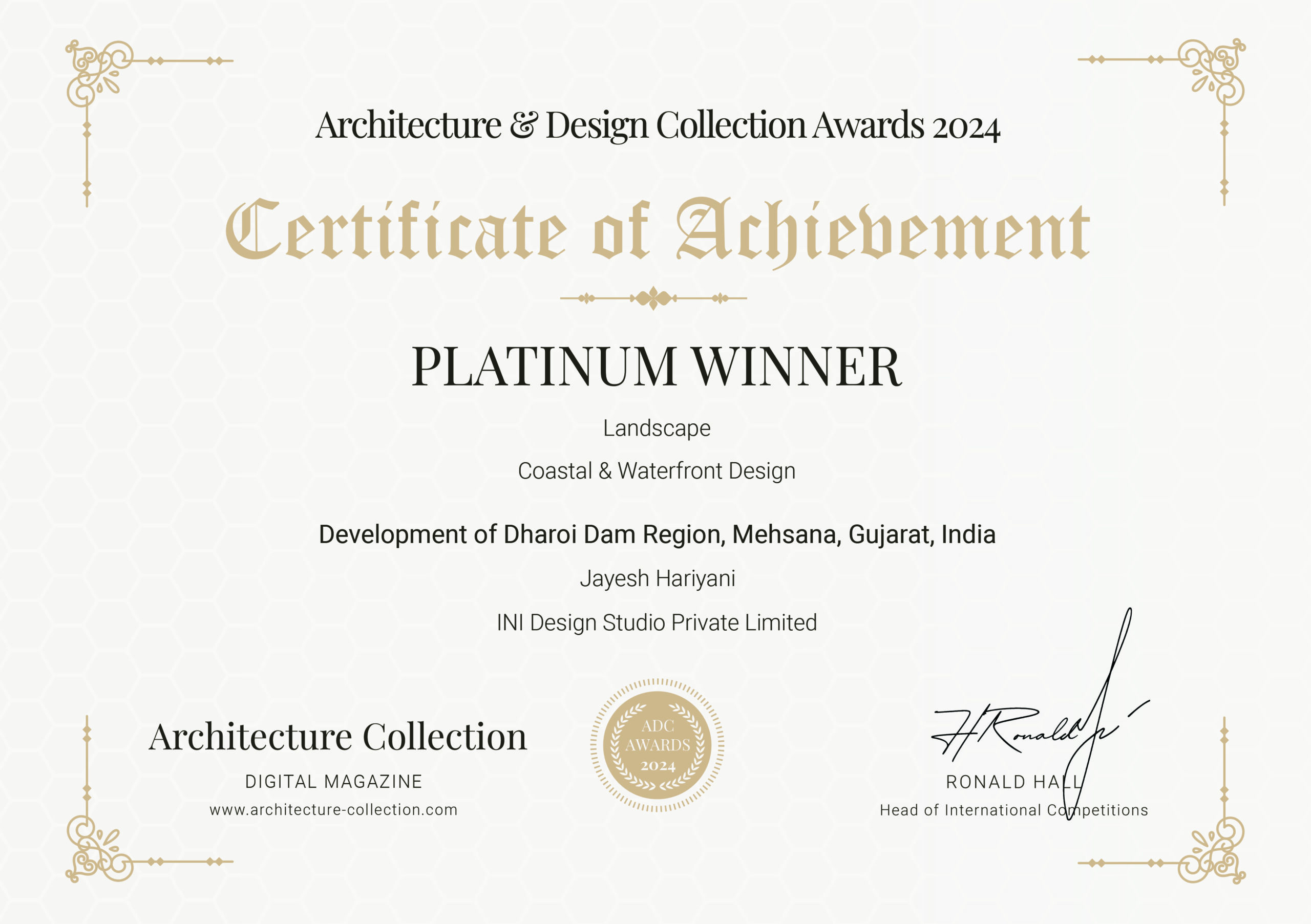 Development of Dharoi Dam Region, Mehsana, Gujarat, India has been distinguished as the Platinum Winner in the Coastal & Waterfront Design - Landscape category at the Architecture & Design Collection Awards 2024.