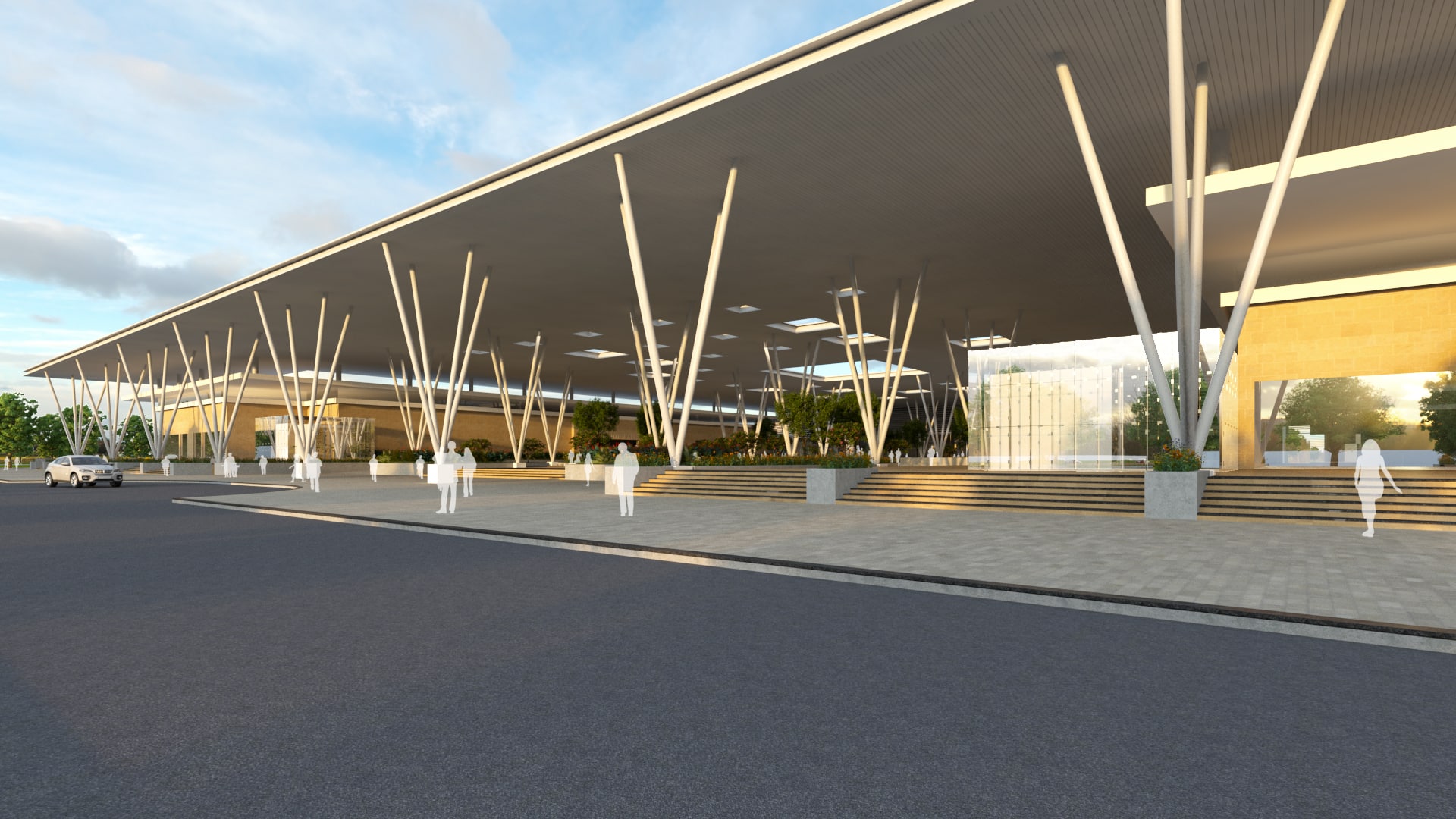 The plan of this facility has been laid out symmetrically around a central axis that aligns with the junction of the main road landing at the approach road. Thus, an inspirational welcome for all visitors is created on arriving to the visual of the facility’s expanse panning out equally extensively on both sides, enhanced by a continuous spread of the landscaped and pillared pavilion across the entire façade. Carrying on further inside, one enters the vast green pre-function courtyard flanked by the exhibition halls to soak in the apt aura of ceremonial inclusiveness in the city’s growth activities, before engaging with the day’s business inside the convention center.