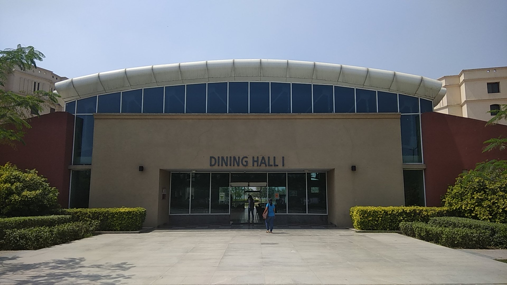 The interior is bathed in natural light thanks to soaring clear story windows, and the hall’s steel & glass clear story roof is a triumphant merger of architecture, engineering and beauty. Entered through a plush reception lobby, the central dining hall feels like an explosion of column-free space made possible by holding up the high roof on an array of large span steel trusses. With sunlight flooding in through the clear-story windows in the stepped up roof, the vibrancy of the interiors is enhanced by the use of colourful chairs lined up along the clusters of innumerable dining tables. With simple minimalist furniture and surfaces and a clutter free organization, a very clean and airy environment is achieved. The entire design is consciously aligned to create a hygienic, warm and inviting ambience for the community of students, faculty members and guests to enhance with their energetic presence.