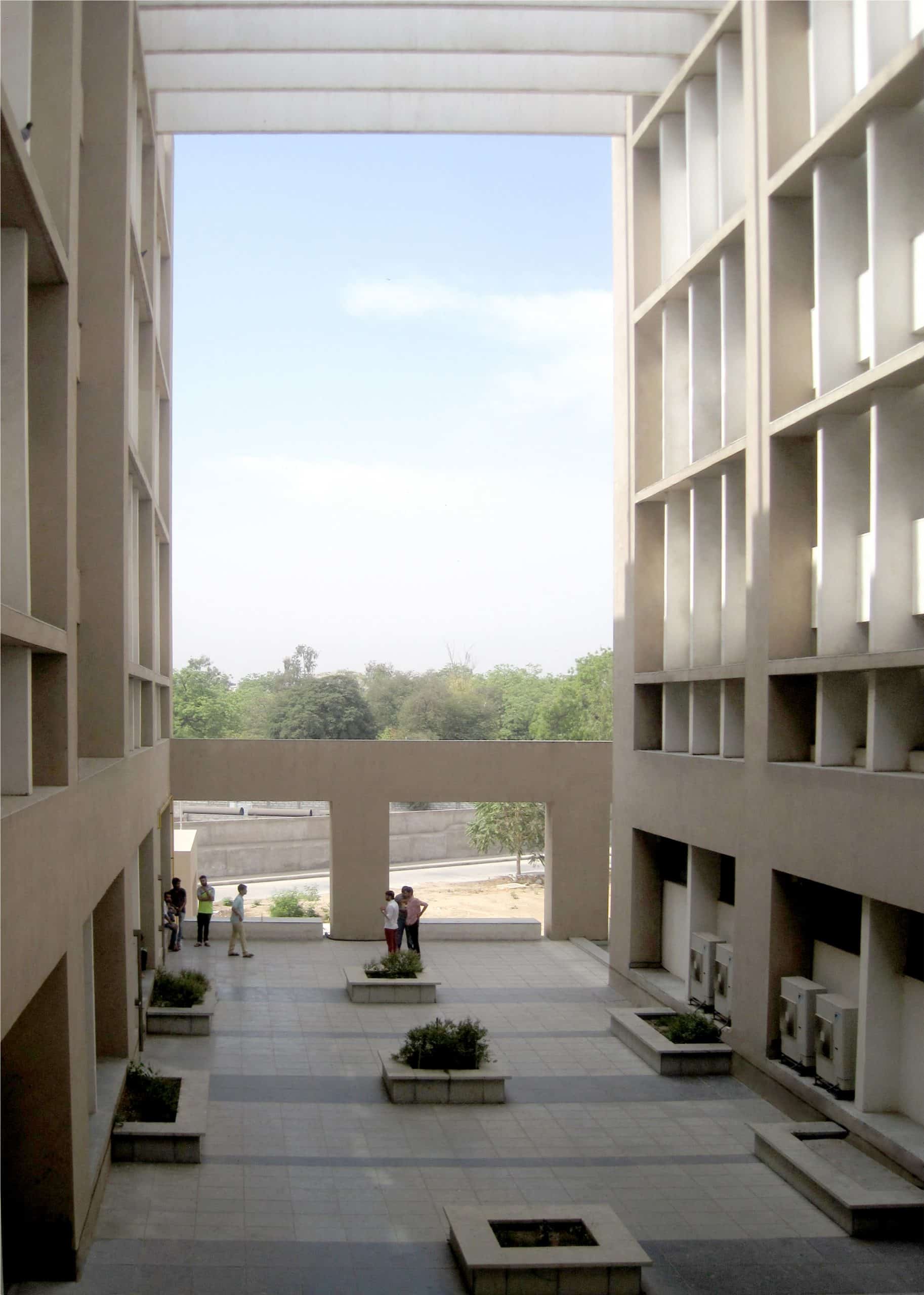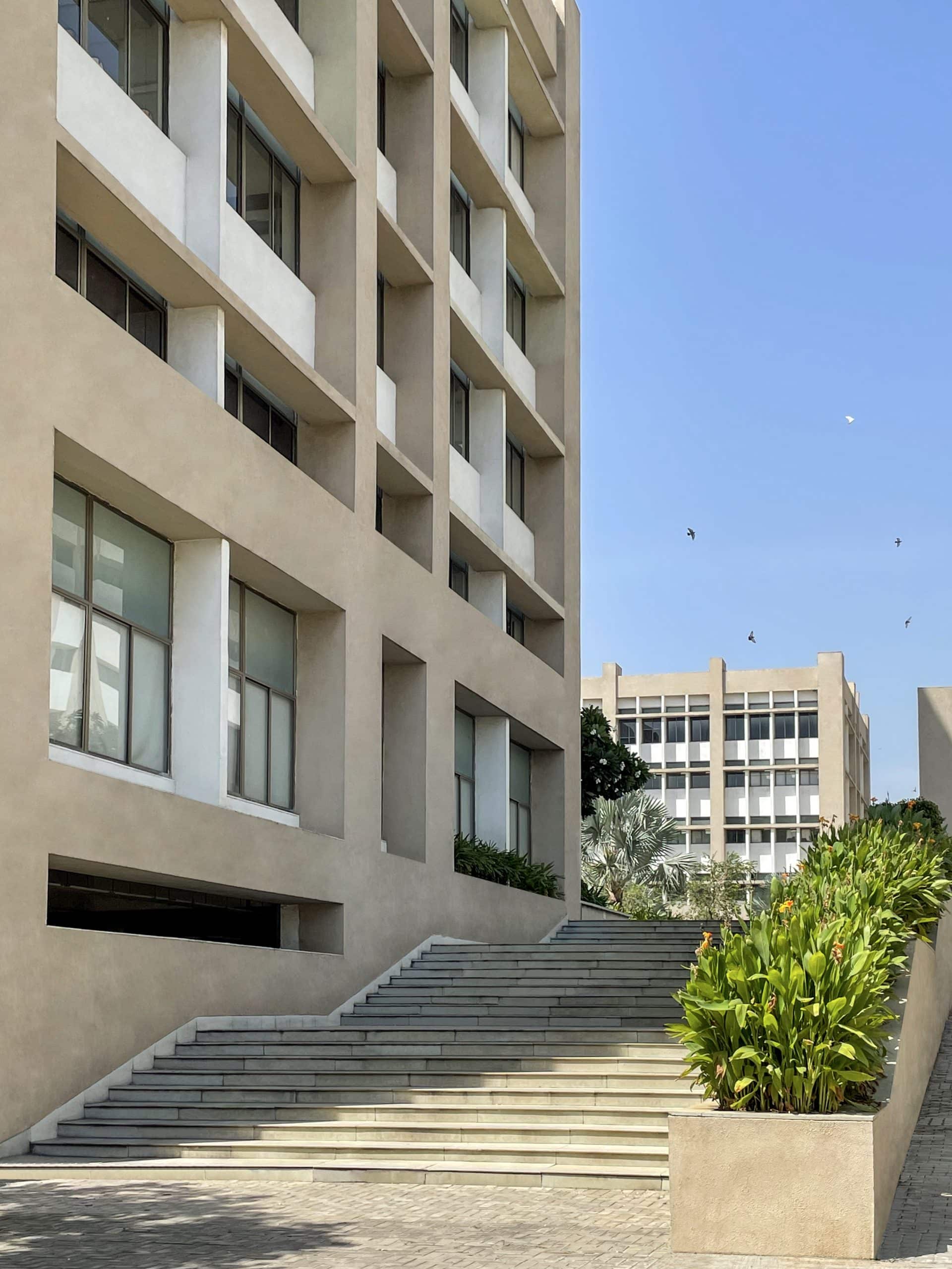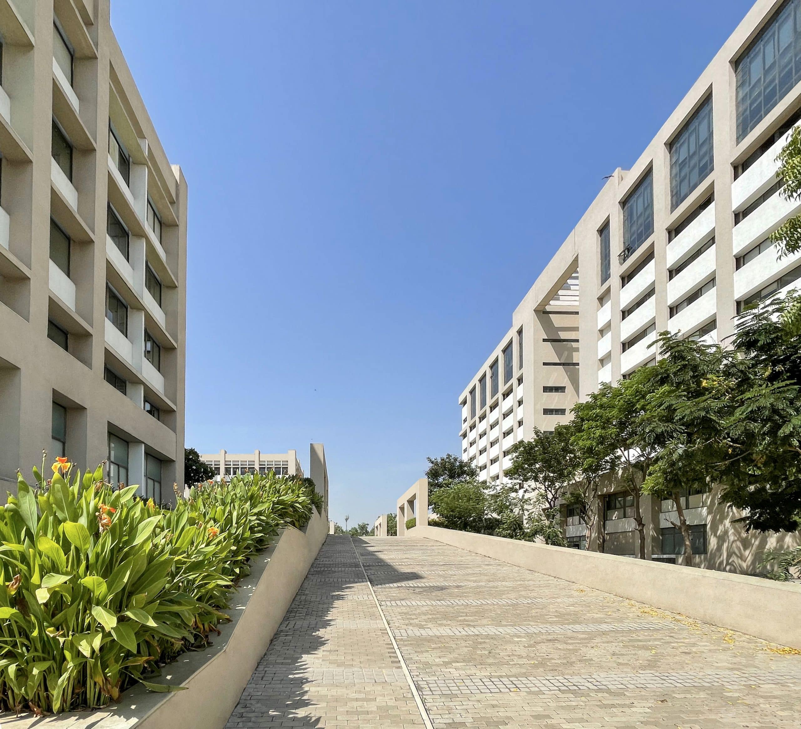 Just as the intermediate court creates an ideal learning and healing community connection between the academic and practice sections of the campus the front of the hospital greets patients and visitors with a landscaped green plaza framing the impactful form of the cancer care building as a destination of faith, hope, wellness and confidence. An architectural grammar of alternating solids and voids is created by the passive strategies adopted for climate response like recessed openings framed by light shelves and shading fins which ensure interior day-lighting free of heat and glare. A complete set of sustainability strategies water, energy and waste management adopted within this campus design make it future-ready in many senses.