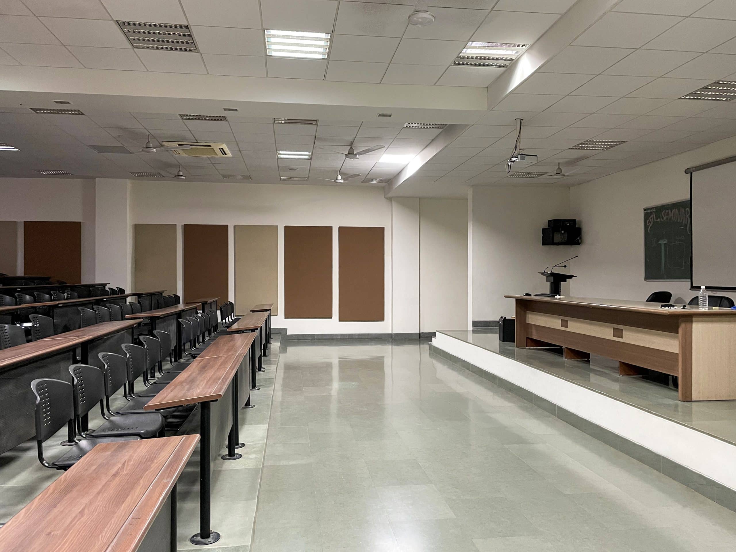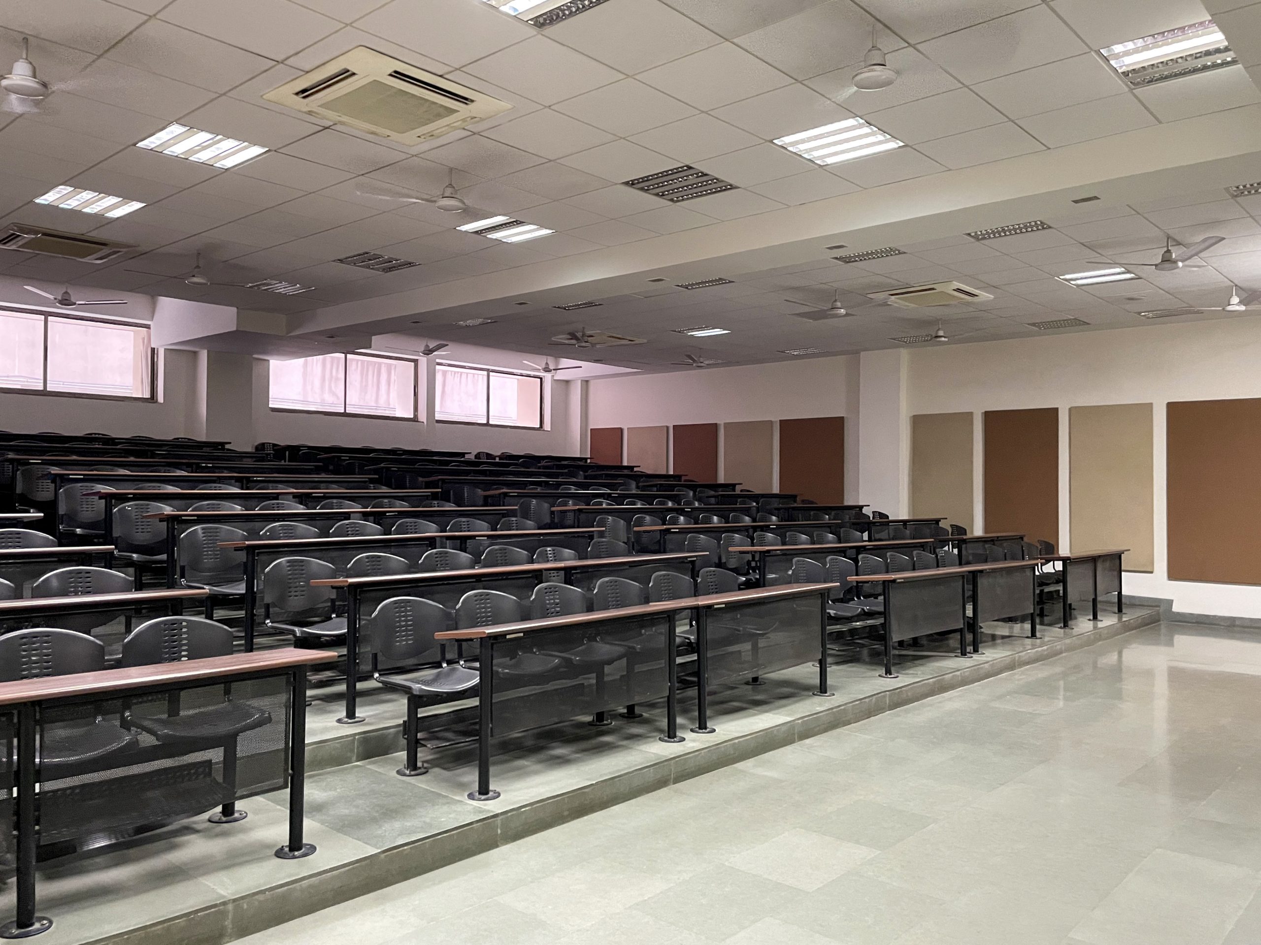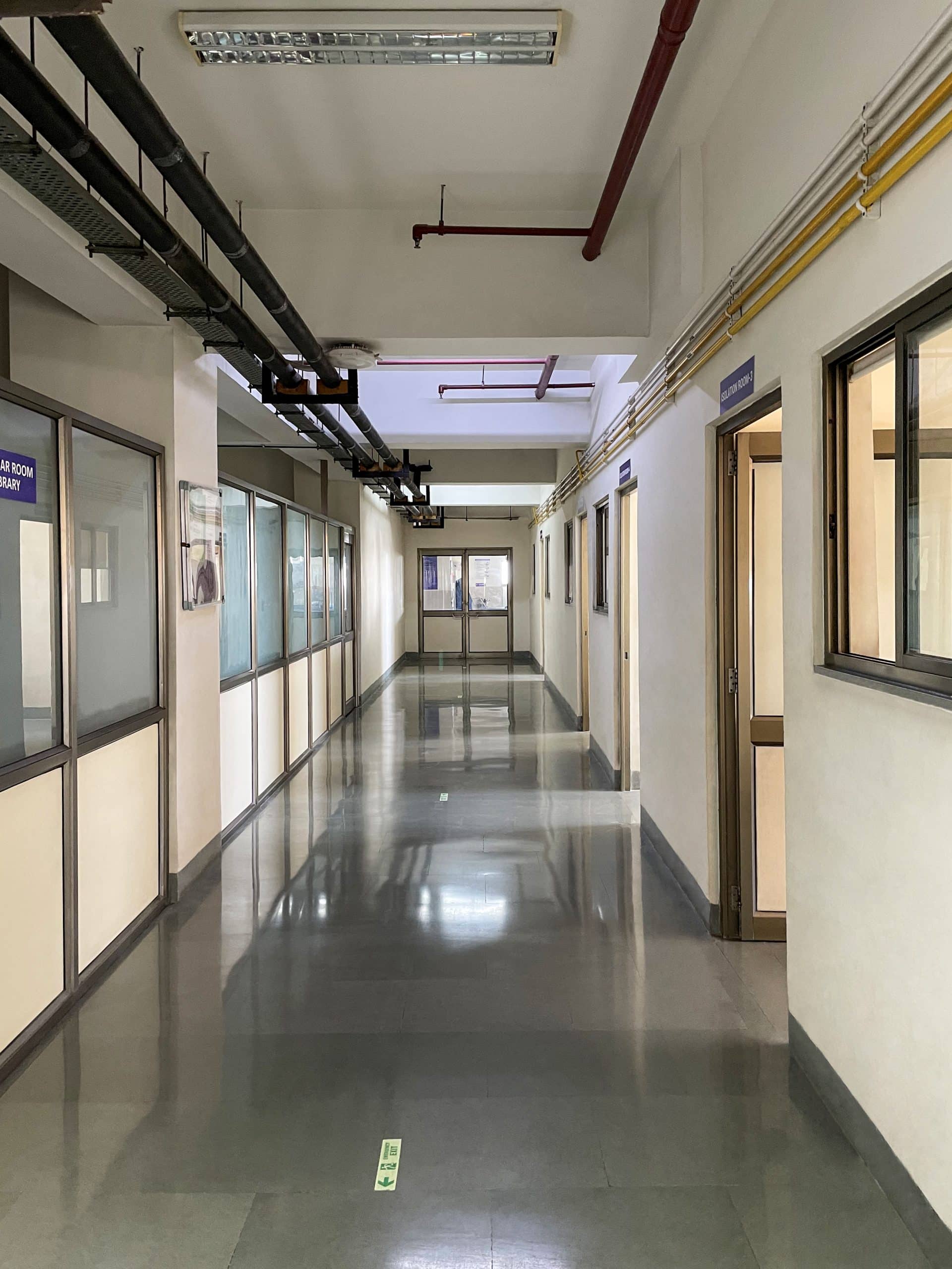 The centrally placed arrival points on both roads bring doctors, paramedics, students and staff on to the large arrival court intermediate to the hospital in front and the college behind it. The college building of ground plus five stories is resolved in three symmetrically dispersed elongated wings placed perpendicular to a connecting central block. The two side wings have most of the lecture halls and departmental labs, while the central wing which projects towards the residential zone in the rear houses a large two storied library and terminates at the third floor.