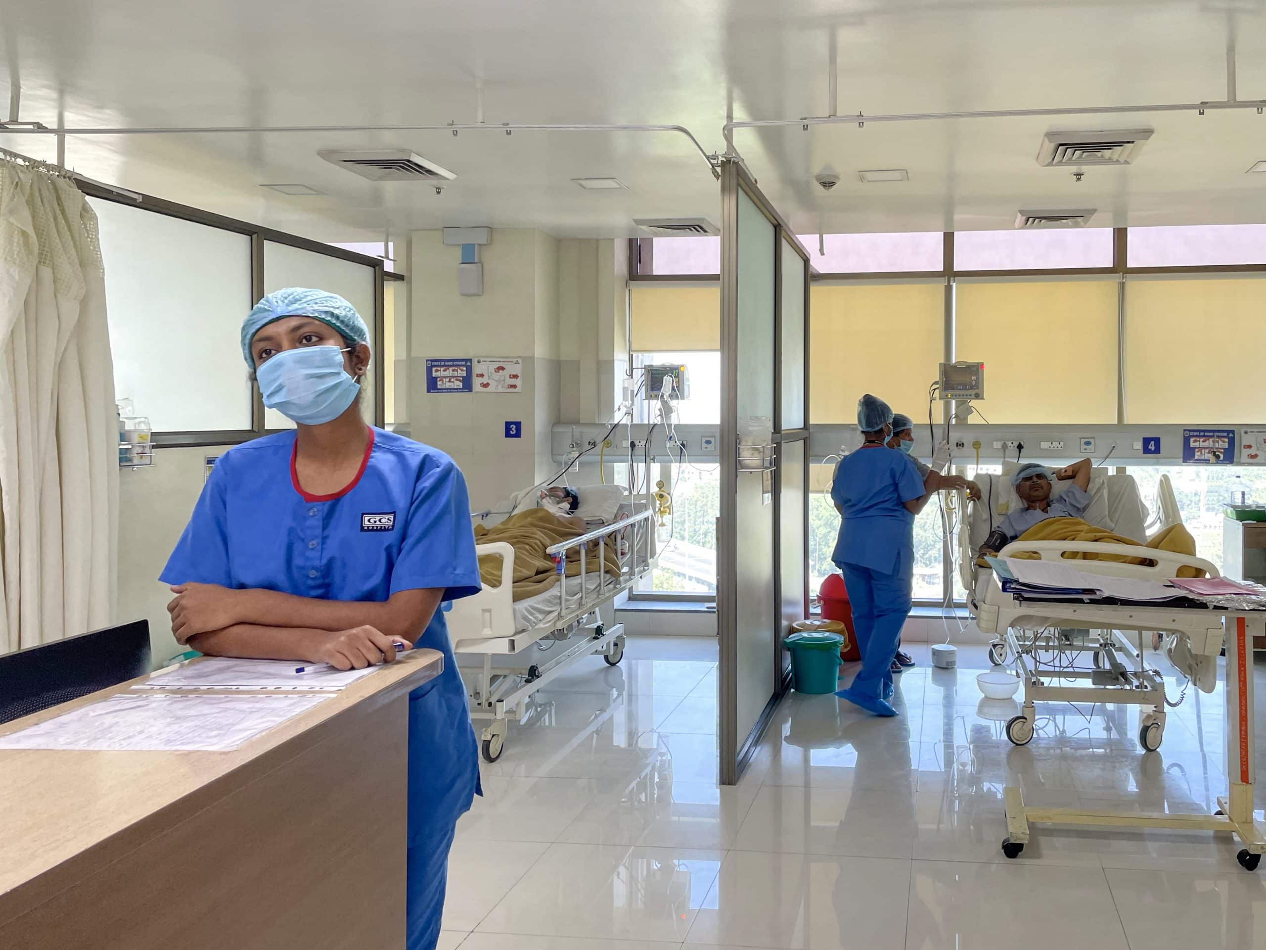 As the northern-most entry point admits patients and visitors into the campus, they enter the ground plus thirteen storied hospital building located at the forefront through a voluminous, well lit and naturally ventilated reception foyer and waiting lounge. From here, a clearly designed way-finding design leads them to various departments dedicated to specialty cancer care and multi-specialty functions dispersed on either sides of this central arrival hall. Wards for in-house patients are located from the third to the tenth floors with the eleventh floor dedicated to operation theatres and the last two floors reserved for future expansion and services.