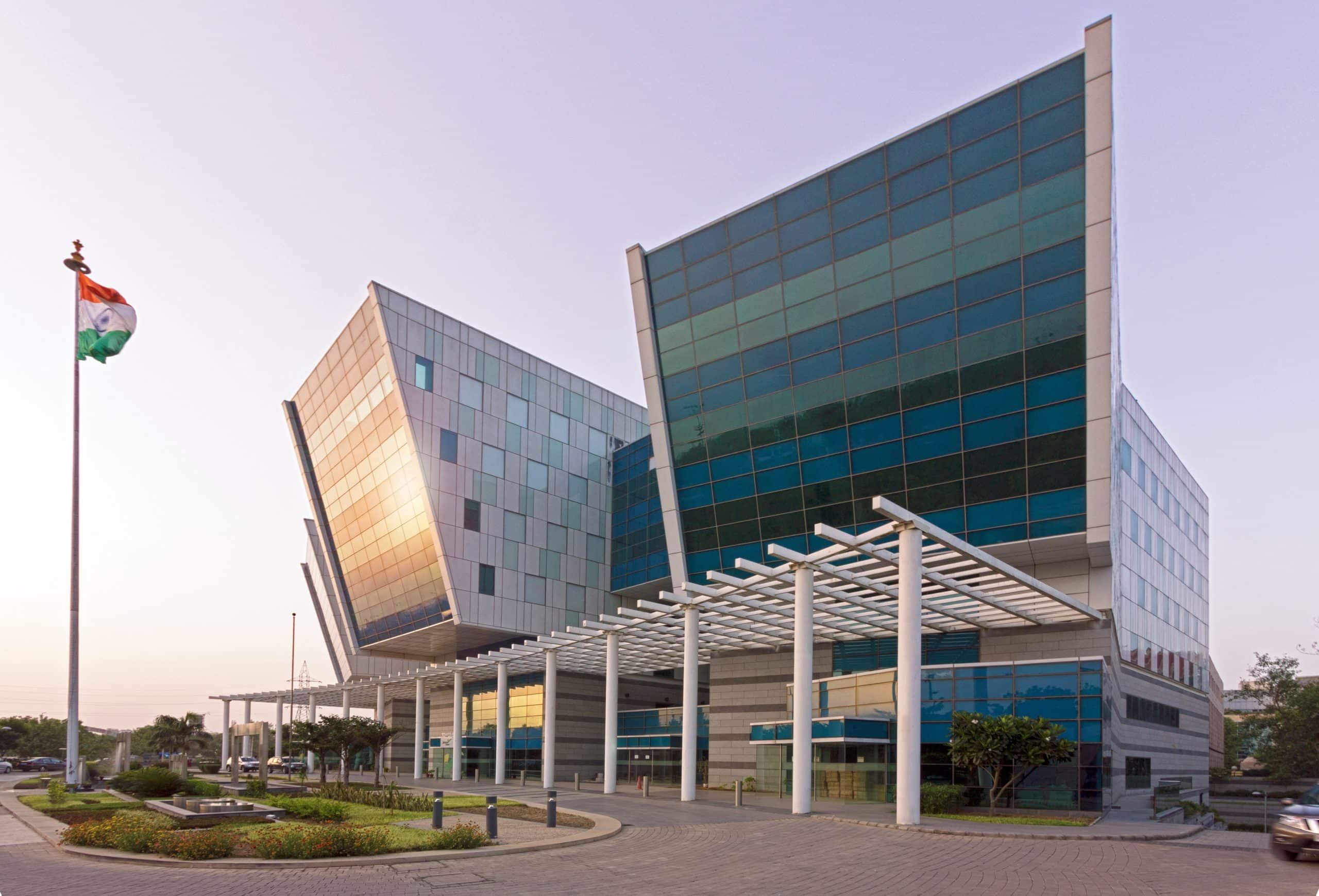 The Jindal Centre located at Gurugram in the National Capital Region is a corporate facility housing the offices of three of the Jindal Groups companies, i.e. JSW, JSPL and JSAW. The architectural articulation of this steel industry giant’s triple concerns comes to life in this three-faced modern corporate structure clad in glazing and composite panels. Essentially laid out as three towers/ wings rising from a common base structure, they appear on the façade as three individual inclined glazed faces. Upper portions of each wing being only 4 (side wings) to 5 (central wing) floors high gives them a horizontal dispensation in the side elevations, as do the cladding bands on the base structure, setting the building apart from the corporate tower typology. The floors in the base facilitate reception, lift lobbies and atrium for all three wings and support amenities. These are fronted by an elegant pergola-covered porch which is further preceded by an elaborately landscaped arrival court greeting visitors & staff as they enter.