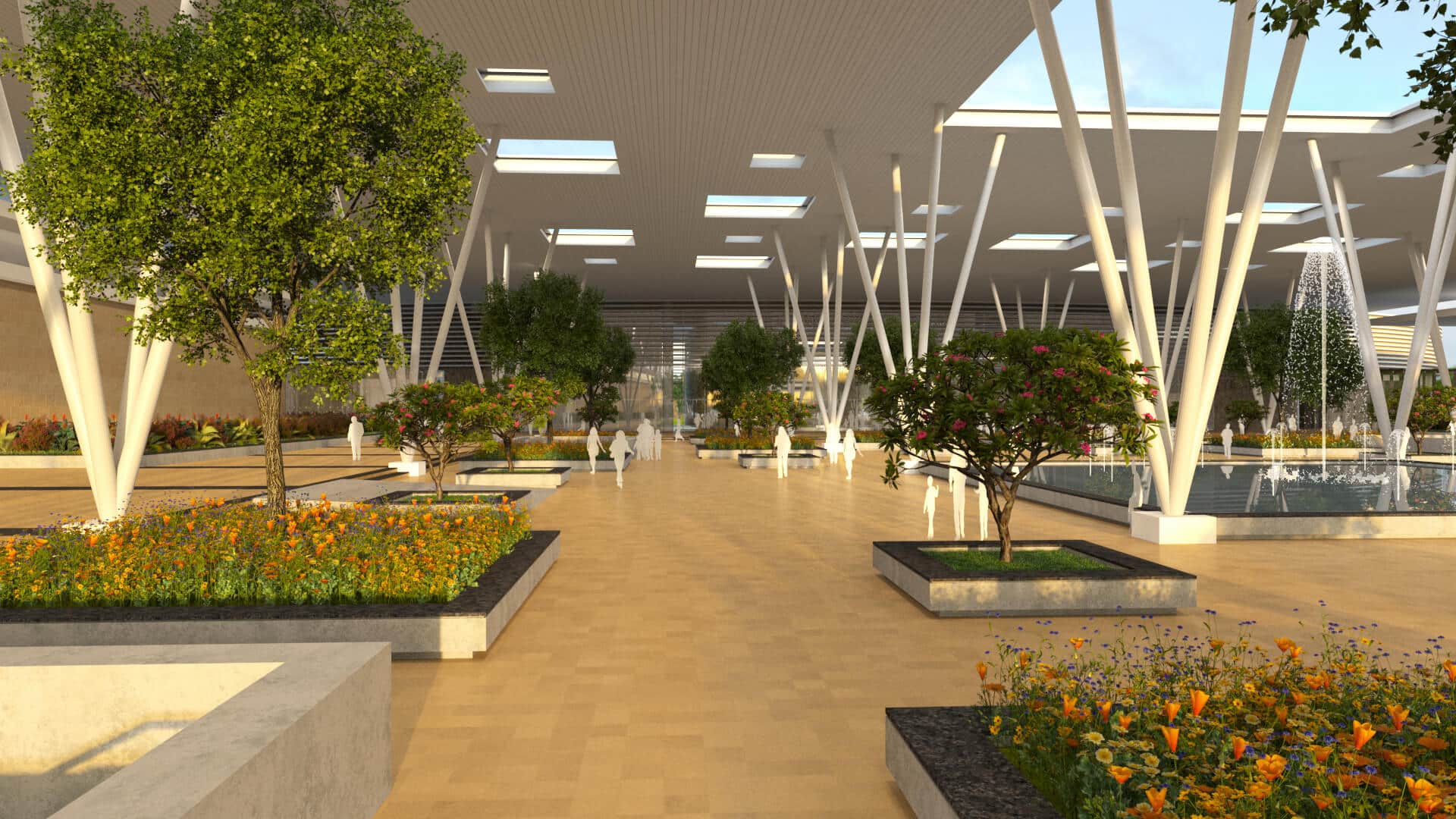 The vehicular entry from the highway into the site leads through a well-planned internal road hierarchy to the parking lot and beyond to the banquet hall and party lawn at the rear eastern end. Pedestrian pathways lead from the pedestrian entry and the parking through an ornamental entrance plaza to the grand arrival hall. From here, visitors may disperse in either direction, towards an array of indoor and then outdoor sports facilities to the north or others to the south. These include the recreational block, shopping, business centre, indoor/ outdoor swimming pools, children’s play and splash pools, guestrooms, spa/salon lined up along the edge of a reflecting pool with a speciality restaurant projected within it, winding around the southern end of the central park.