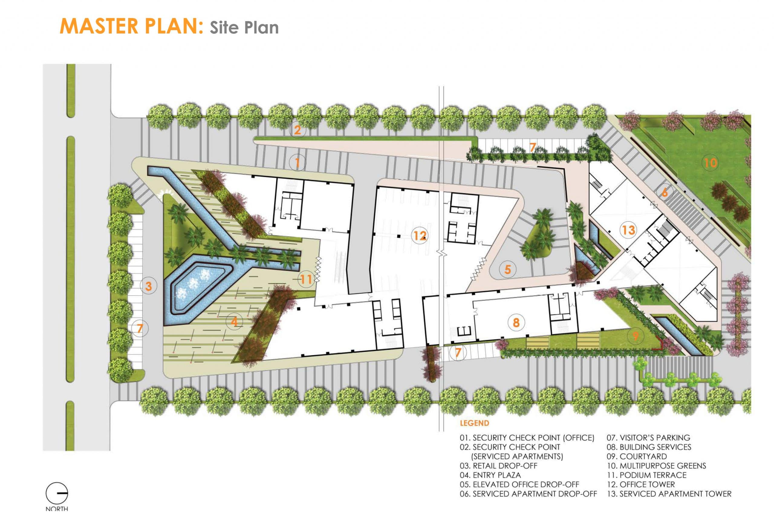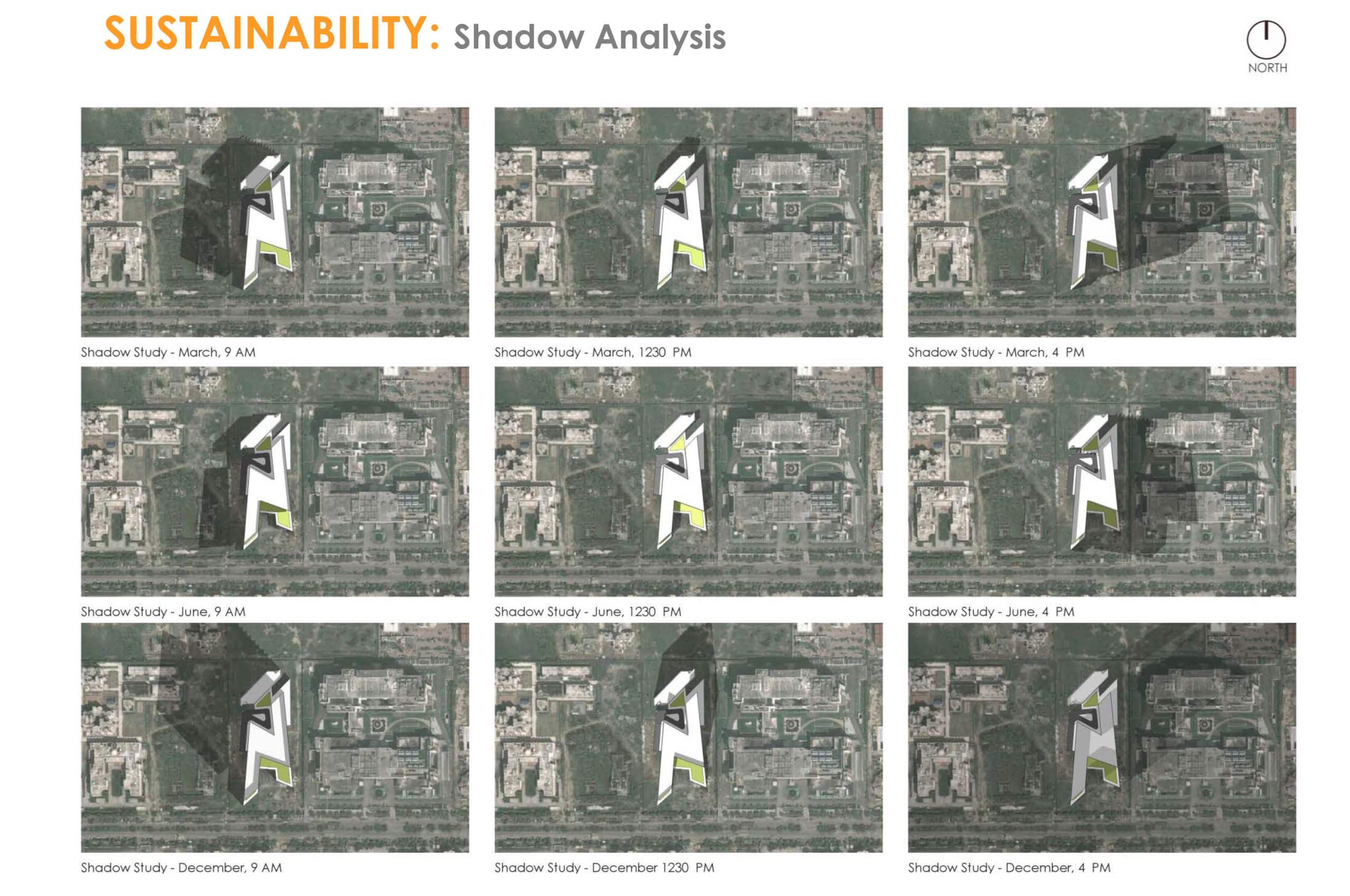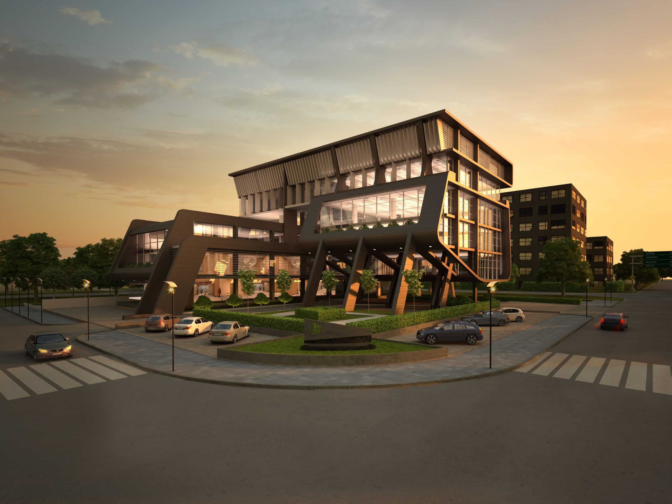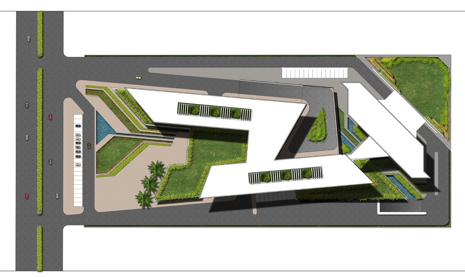 As mandated by the client, the design complies with Vastu Shastra fundamentals as can be seen in the northern site entry, east facing entry to most offices, underground water tank in the north east, western drainage discharge, widened frontage between two tower arms lending a Singhmukhi front, and the south western corner being the highest point of the building.