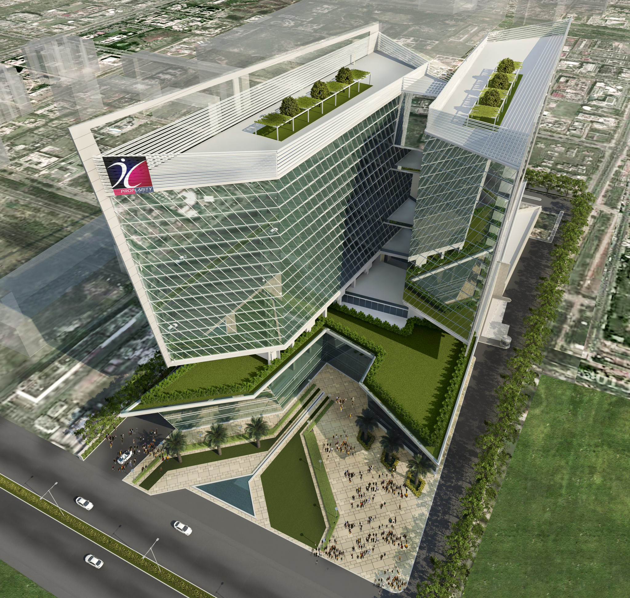 Climate response is inherent in the design when the inner faces of the towers’ fully glazed arms allow mutual shading and the outer faces are adorned with perforated metal screens which cut out the heat and glare while optimizing daylight. Sustainability and green building strategies have been extensively adopted in planning, execution and active life cycle of the building through measures such as use of Low E high-performance DGU glass for exterior glazing, green roofs & vertical gardens, solar PV panels, naturally ventilating vertical courtyards, rainwater harvesting, grey water recycling & reuse, efficient plumbing fixtures, operable windows and motion & CO2 sensors connected to central air-conditioning, day-light sensors connected to efficient electrical fixtures and many more,