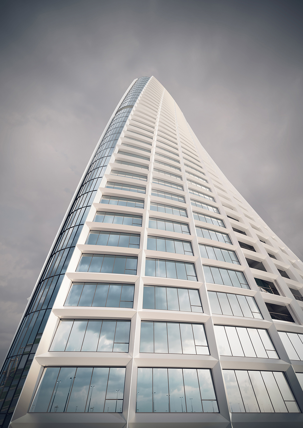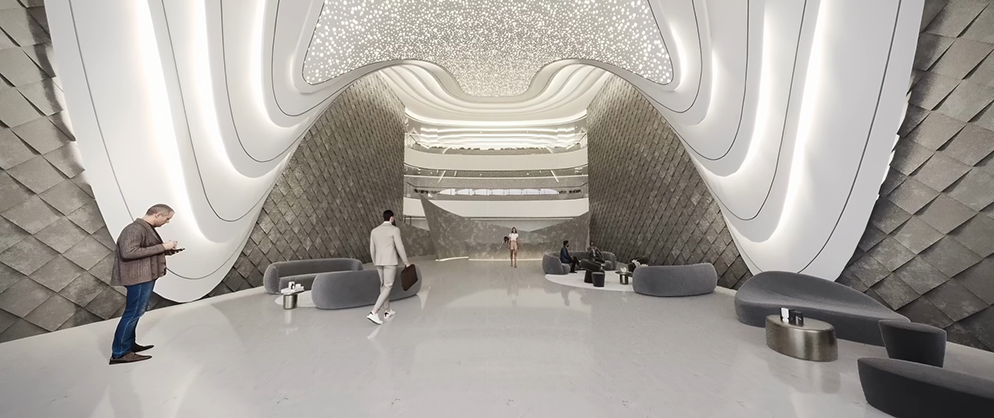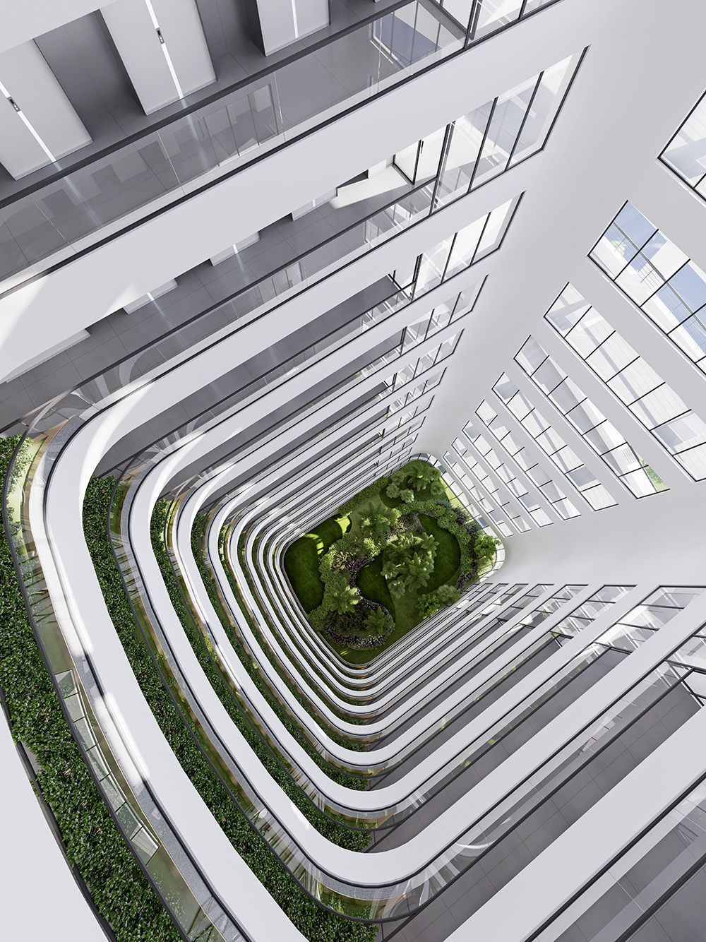 Commanding attention with lines and twists, the 38-degree rotation of each floor plate echoes the evolving Gift City skyline. The extension of curved lines is continued throughout the surrounding landscape, public plaza and drop off driveway, creating a cohesive and harmonious visual language, seamlessly integrating the architecture with landscape. A focal point of the drop off driveway is a captivating sculpture that evokes a sense of movement and fluidity, through its form and material, complementing the building's contemporary aesthetic. The overall design reflects the aspirations of the finance and technology sectors in India, providing facilities and amenities that support their growth, thereby ensuring a space where innovation and ambition converge seamlessly.