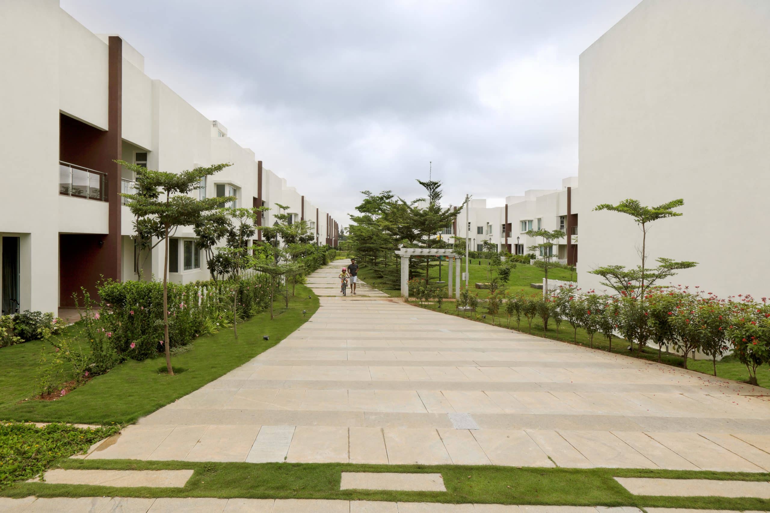 A revolutionary approach in terms of residential development, the Grand Carmen boasts of being a predominantly tar-free community with walkable neighborhoods. Each of the houses is connected vertically through the basement, from where residents can ascend up to their individual houses after parking their vehicles. This allows for manifold landscape insertions on the ground level. The major concept is of meandering streets that open up at some spots and narrow down at others, offering myriad quality to the path. All the units are arranged perpendicular to the street, with the front-end opening on to the street and the rear-end opening towards a private green, shared within a cluster. Each of the open spaces has a different character to it expressed through intricately designed landscape elements such as water feature, gardens, plaza and play areas. The pedestrian walking path is the essence of this development and sets it apart from conventional housing schemes.