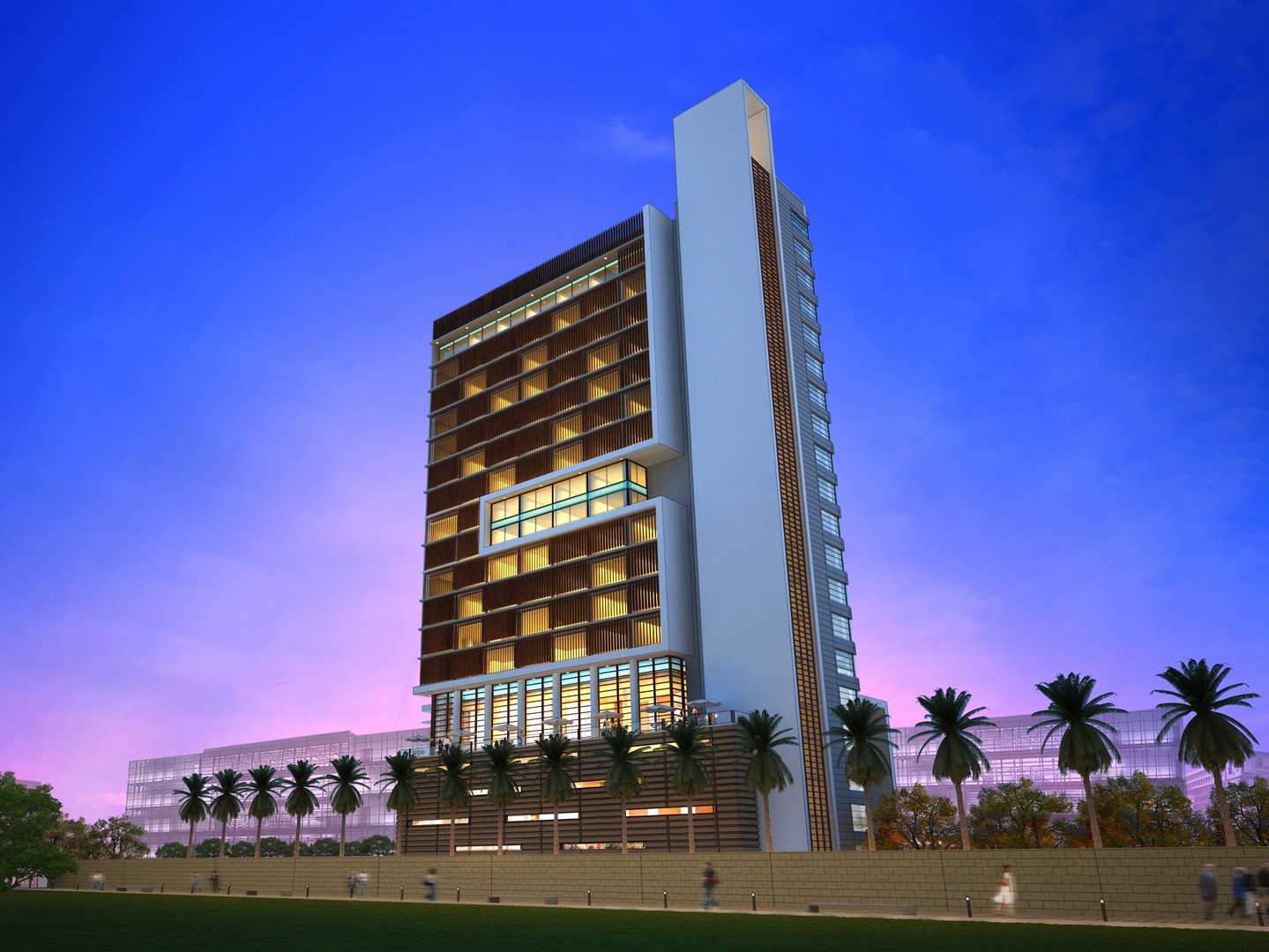 The ground plus seventeen story hotel has its café, bar and restaurant with kitchens and ancillary facilities, as well as a business center & meeting rooms on the bottom four floors, and a banquet hall on the fifth floor. F & B outlets like a lounge and bar as well as spa and gym come up on the sixteenth floor, topped by an open-to-sky deck with a swimming pool on the seventeenth floor. 180 guest rooms of around 35 sq m are housed from the fourth to the fifteenth floor along doubly loaded corridors accessed by guests’ elevators and stairs from one end and service/ housekeeping elevator/ stairs from the farther end.